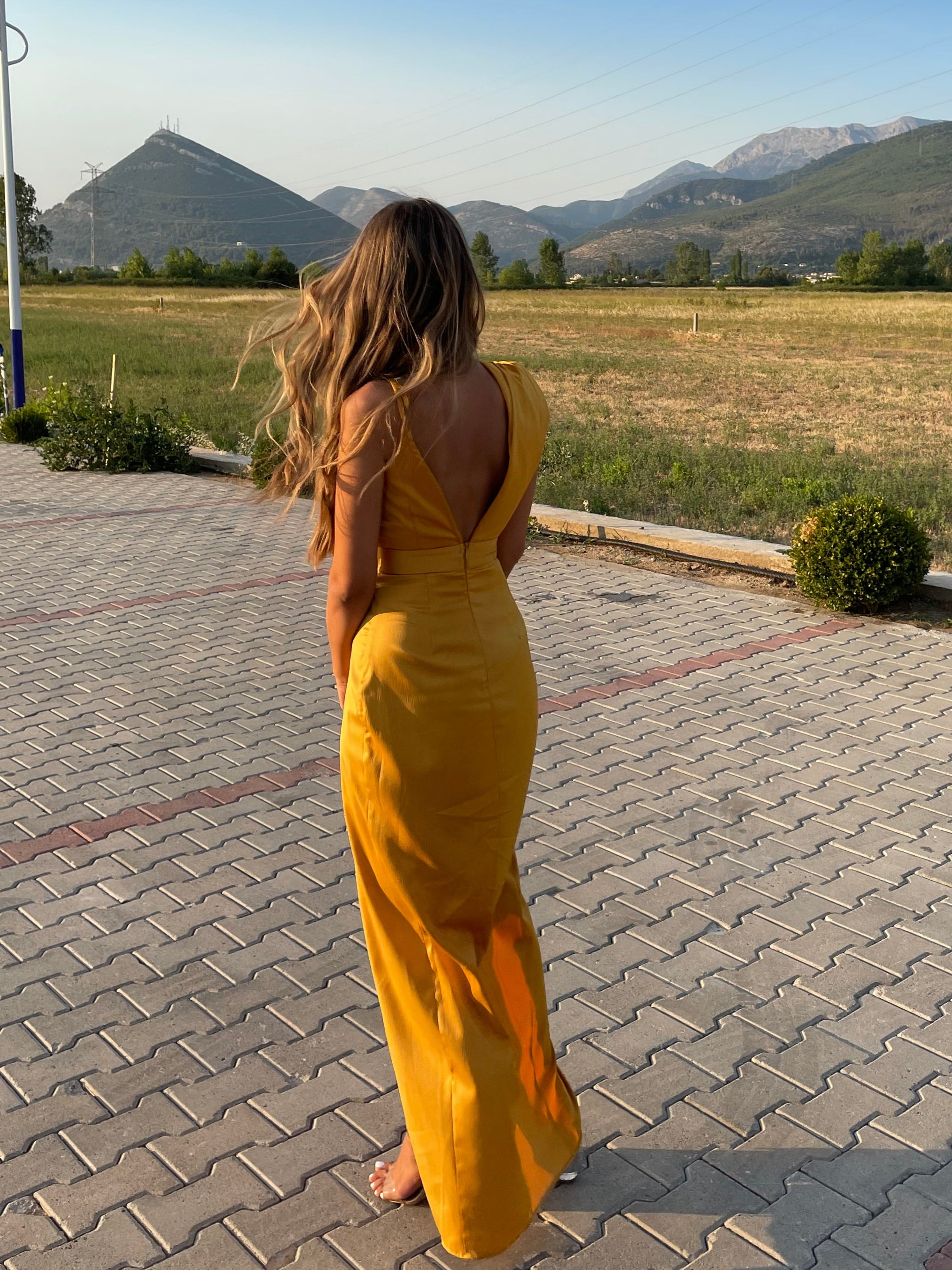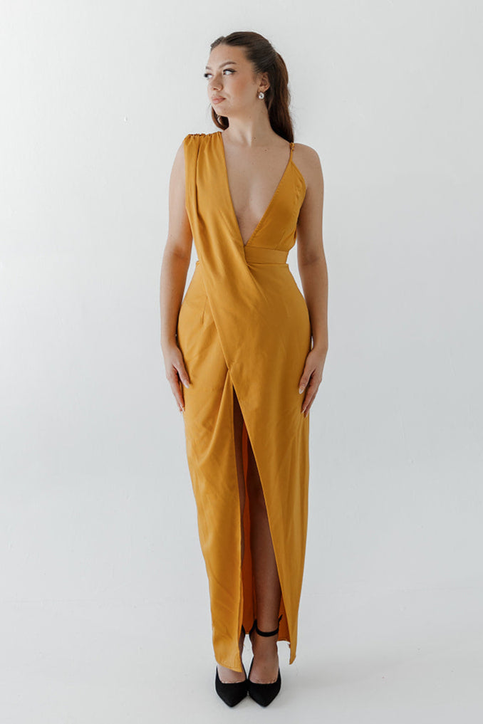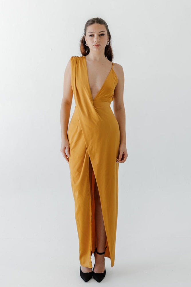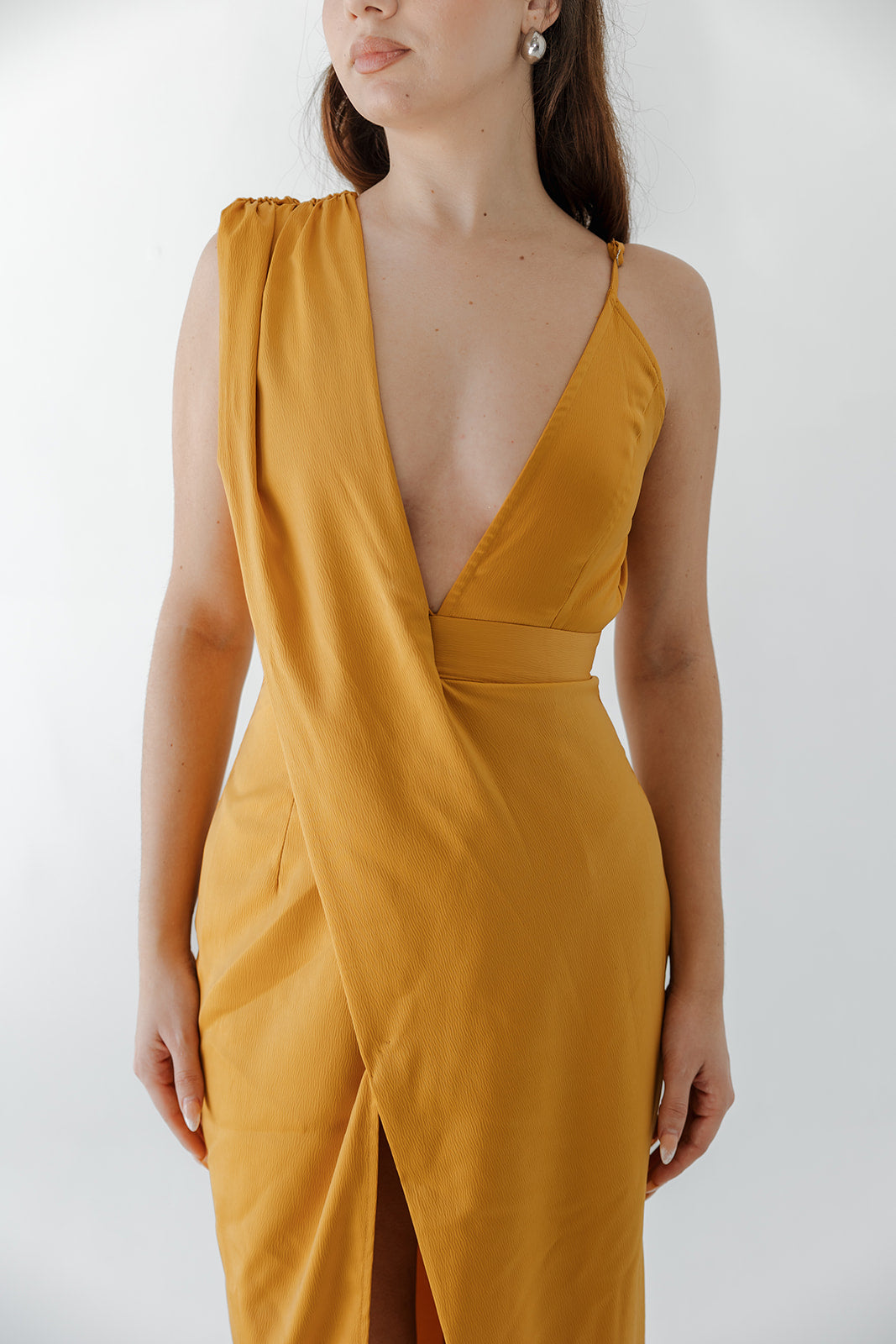 The Helena Drape Dress is a masterpiece of contemporary design. Its daring plunging neckline balances with a high slit, providing just the right amount of allure without compromising sophistication. The rich mustard hue complements various skin tones, while the smooth fabric contours gracefully, enhancing the wearer's silhouette. This dress stands out at any formal occasion, promising both comfort and style.