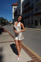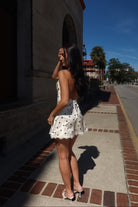 Playful yet chic, this cream satin mini dress is patterned with classic black polka dots for a timeless look with a flirty twist. The halter neckline with scalloped trim adds feminine detail, while the fitted slip silhouette highlights your shape. Perfect for rooftop cocktails, brunch dates, or summer parties, this dress blends retro charm with modern allure.