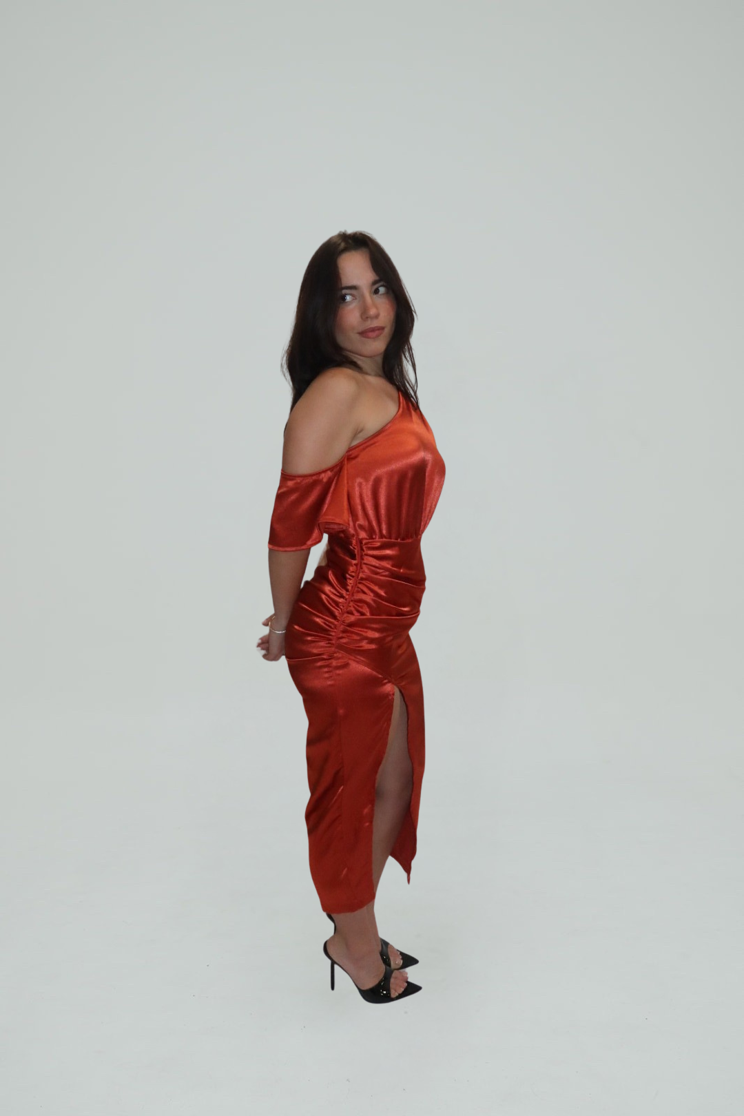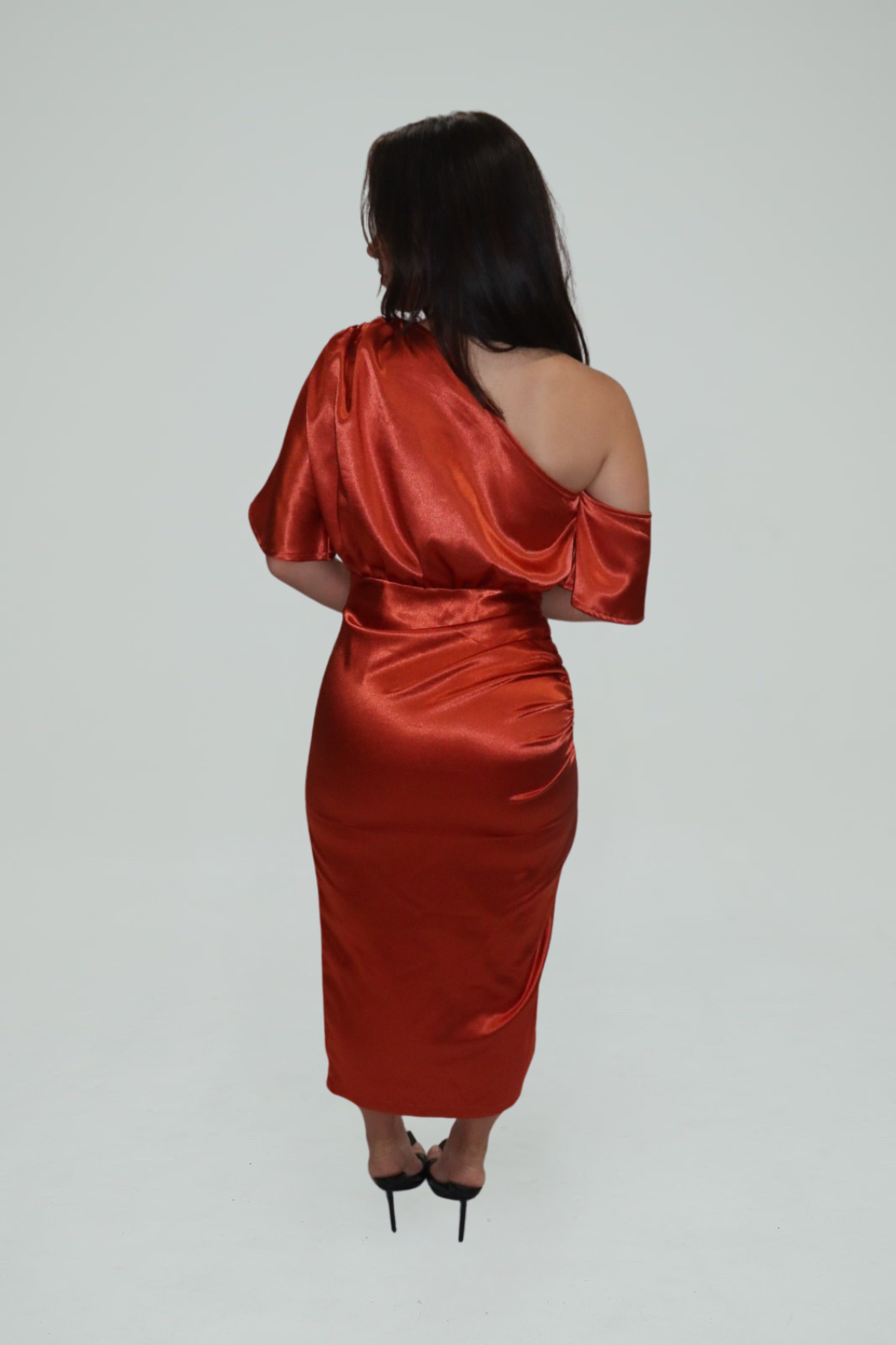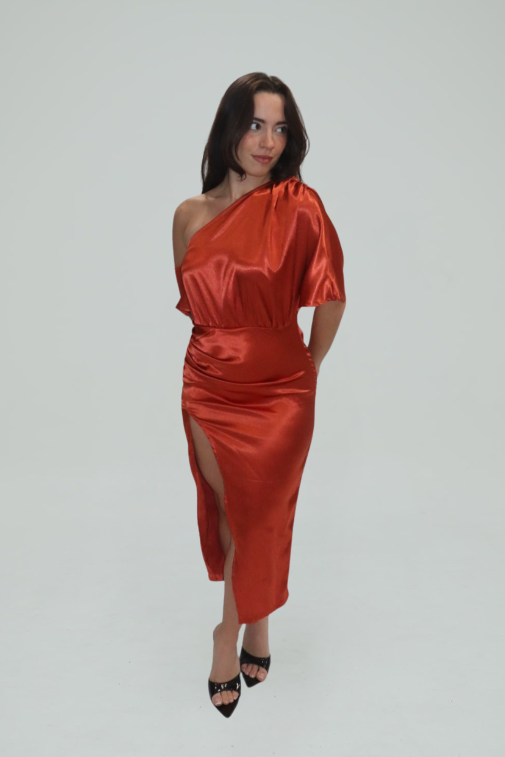 The Ember Satin Drape Dress. Smolder in this one-shoulder burnt orange satin midi dress that radiates sultry elegance. The asymmetric neckline and softly draped sleeve balance structure with movement, while the high leg slit brings undeniable allure. A cinched waist and back zip closure hug the figure in all the right places.