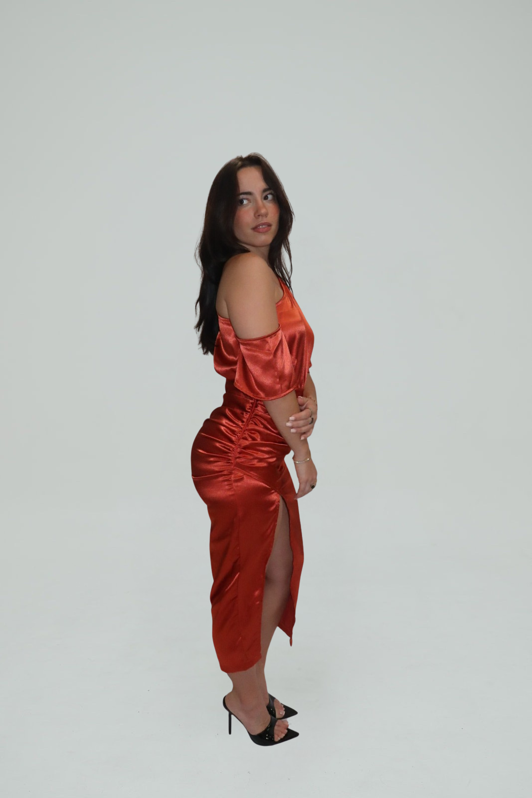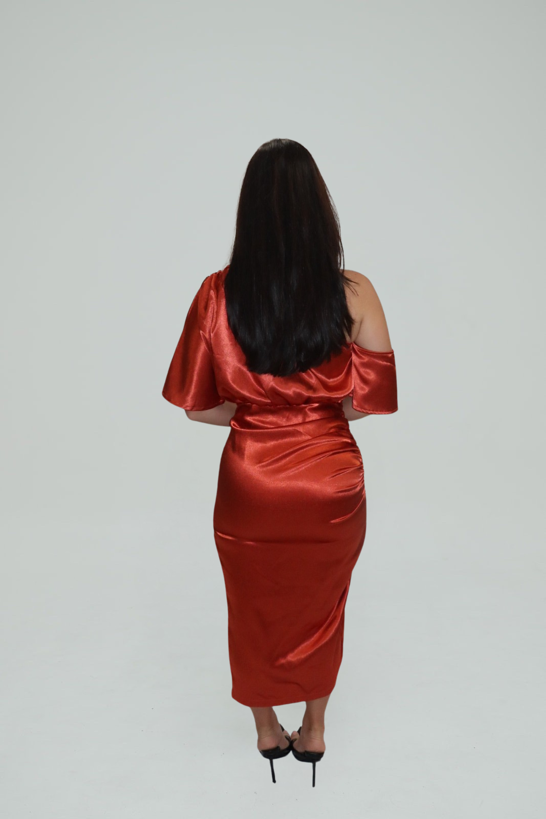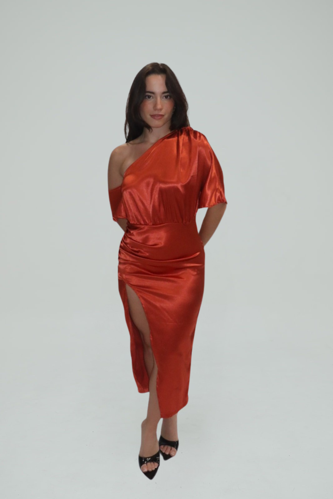 The Ember Satin Drape Dress. Smolder in this one-shoulder burnt orange satin midi dress that radiates sultry elegance. The asymmetric neckline and softly draped sleeve balance structure with movement, while the high leg slit brings undeniable allure. A cinched waist and back zip closure hug the figure in all the right places.