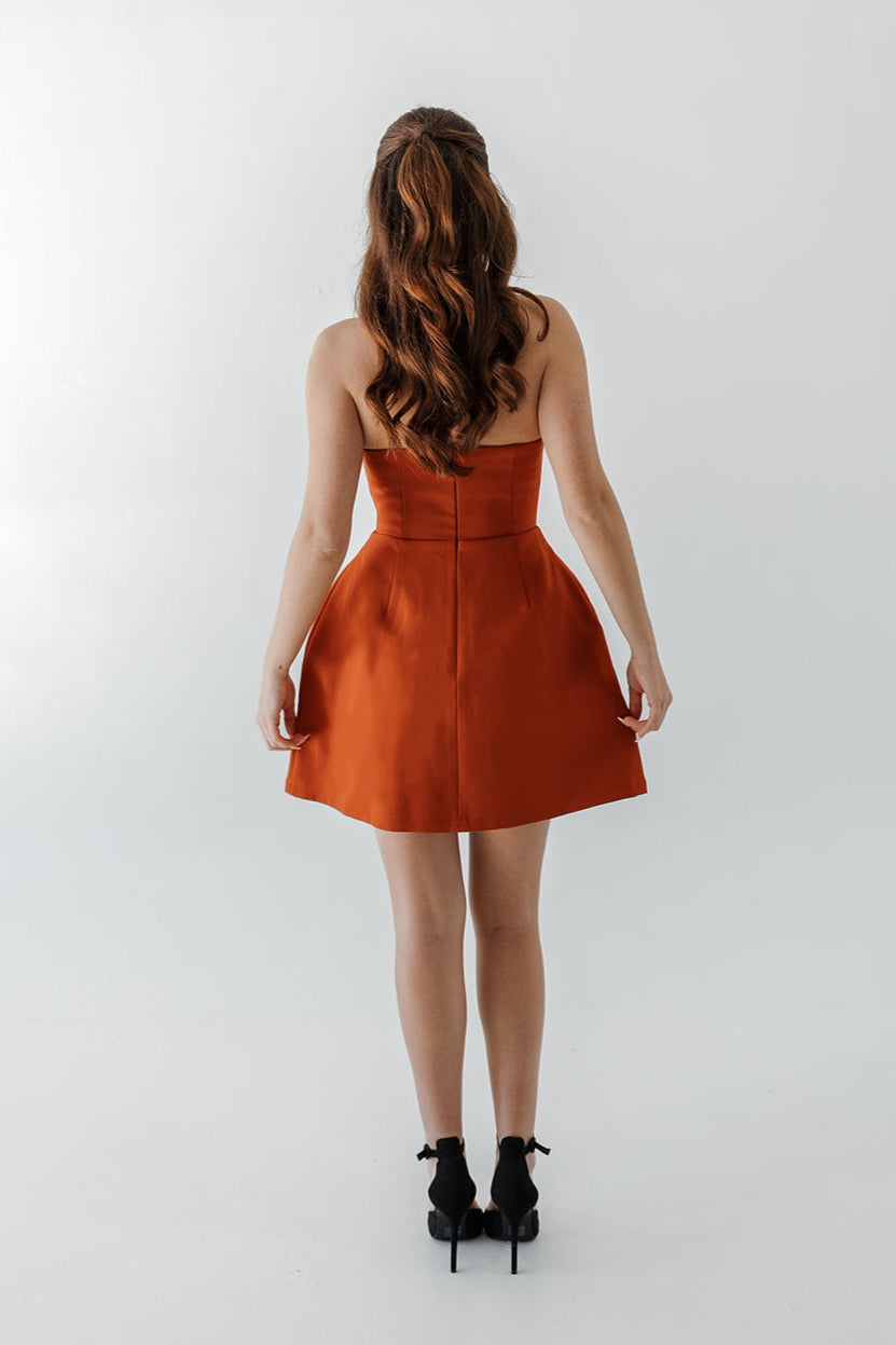 Turn heads with this chic and contemporary Renise Burnt Orange Mini. Featuring a structured bodice and an asymmetrical hemline, this dress exudes sophistication and modern charm. The added flap pocket details bring a playful yet polished edge to the design, making it a versatile choice for parties or stylish daytime outings.