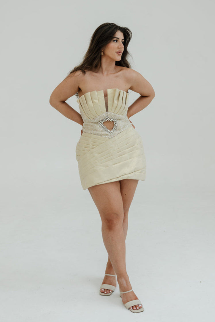 Elevate your evening ensemble with the Grace Gold Mini Dress, featuring structured pleats and a luxurious gold satin finish. This statement piece offers a regal touch to any event.