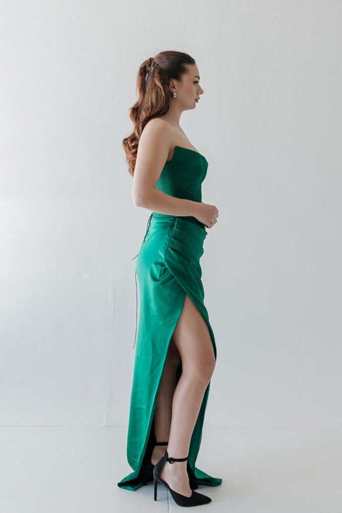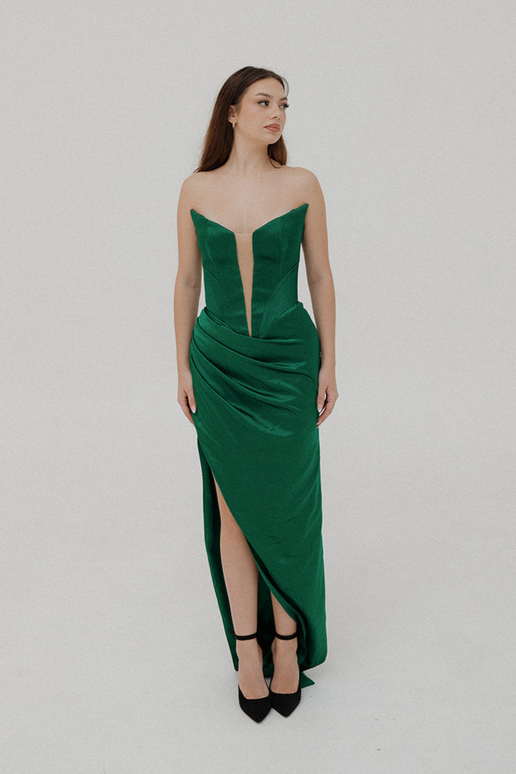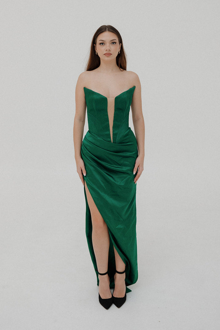 The Oz Emerald Gown is a striking piece that combines a deep green hue with a daring plunging neckline and thigh-high slit. Its fitted silhouette enhances your figure, while the bold design ensures you’ll make a statement at any event.