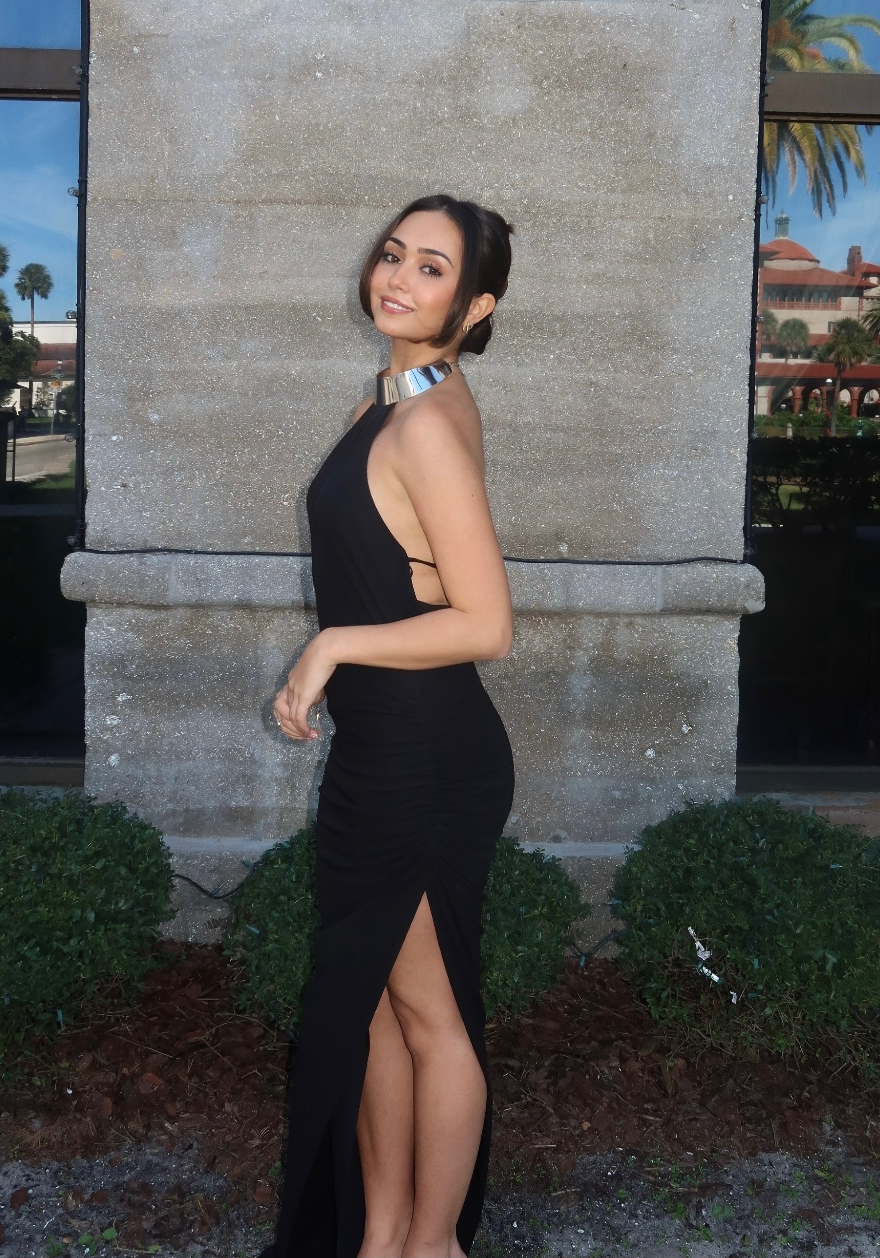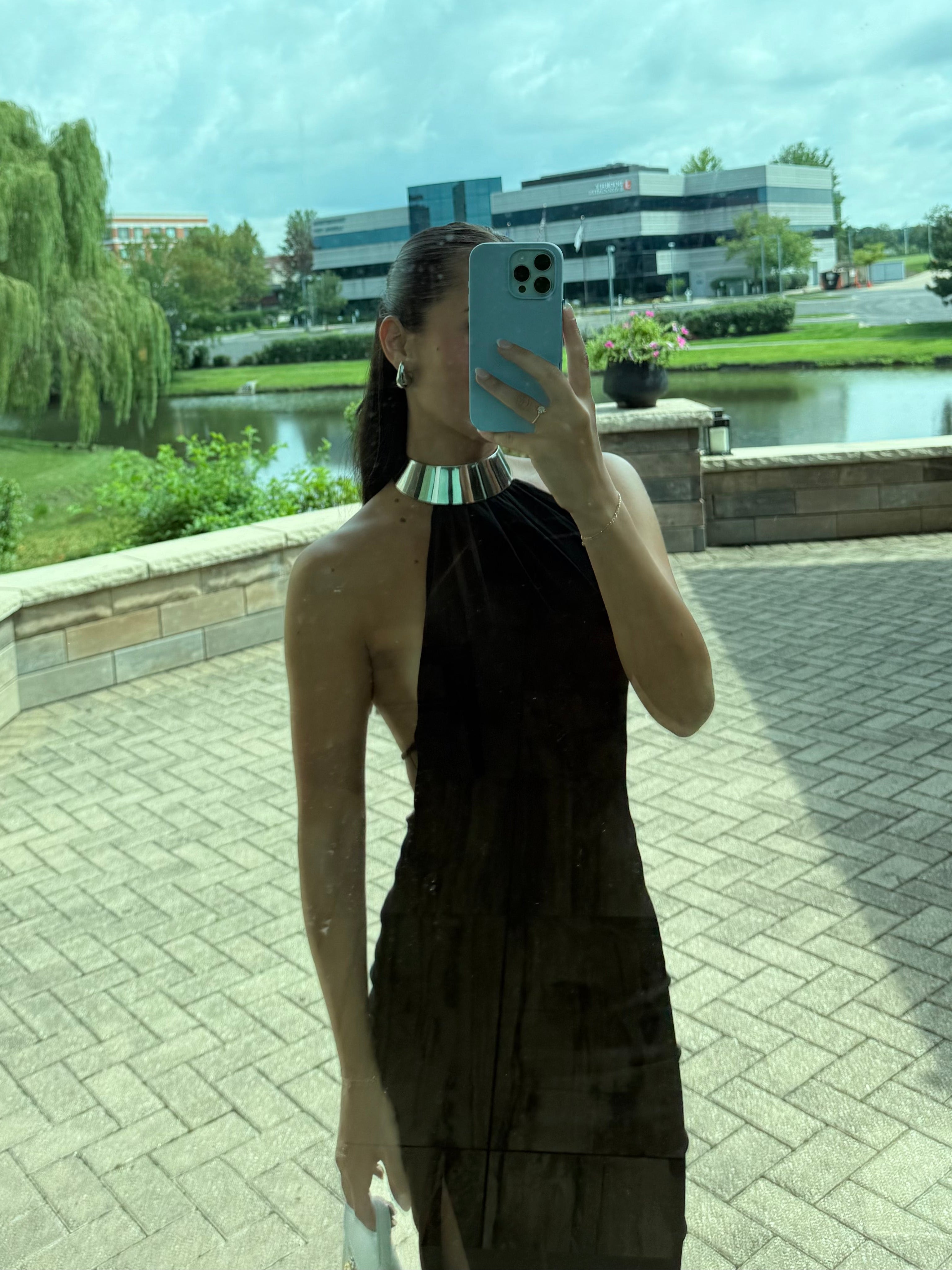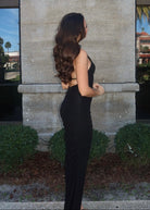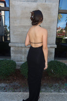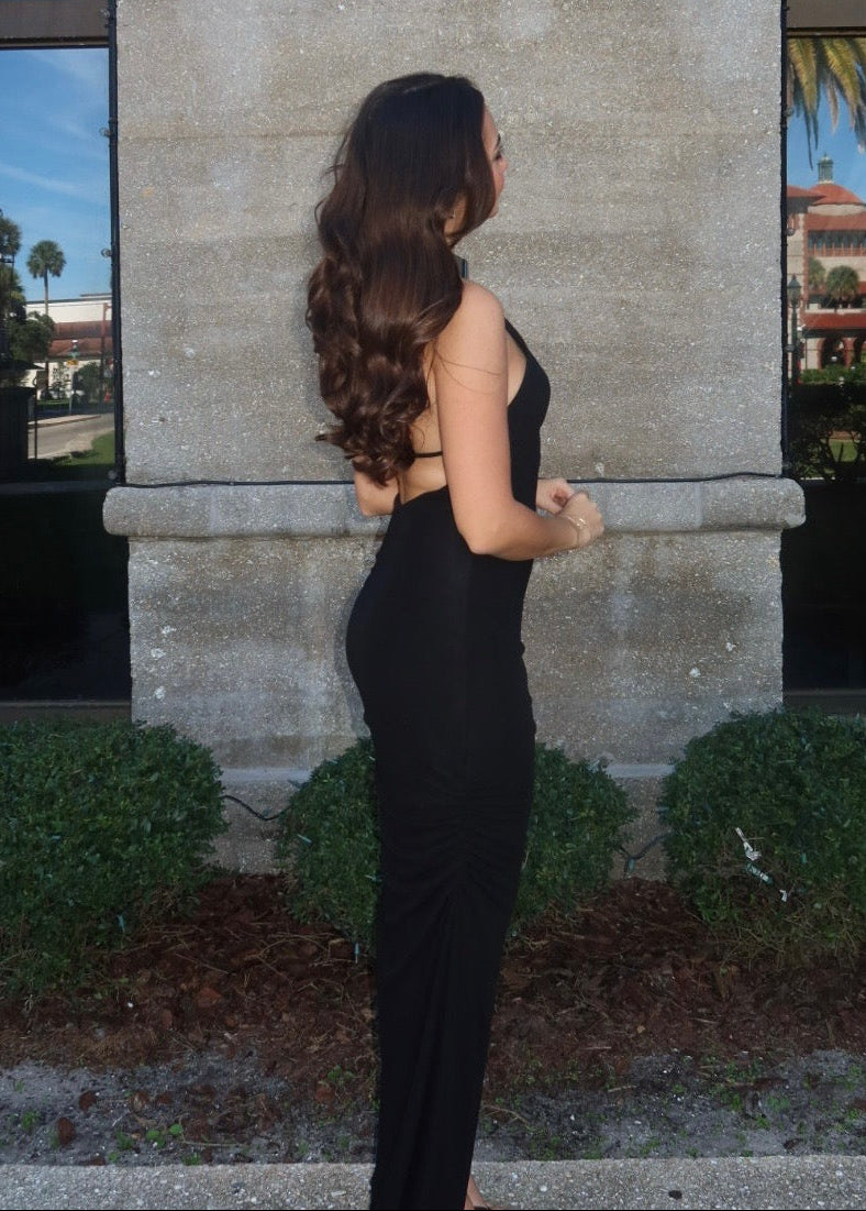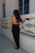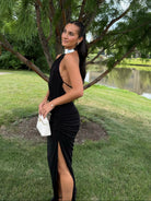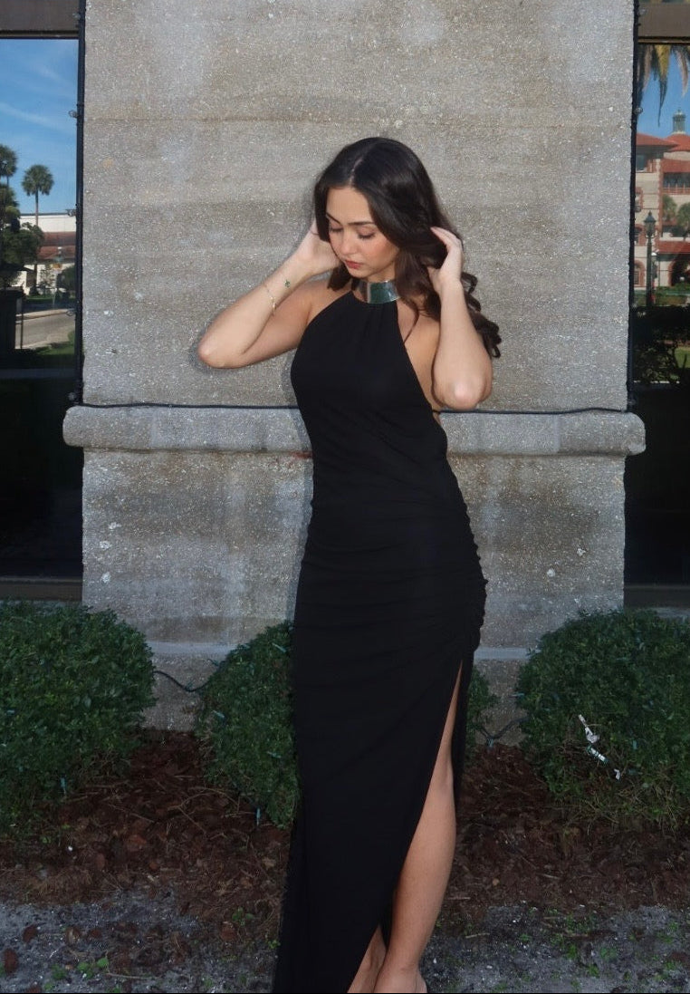 Sleek and commanding, this black halter, backless gown is finished with a high-shine metallic neckline that doubles as jewelry. The body-skimming silhouette is balanced with a daring thigh-high slit, while subtle ruching at the hip adds a flattering drape. A true power piece, it’s perfect for red carpets, formal galas, or nights that call for unapologetic elegance.