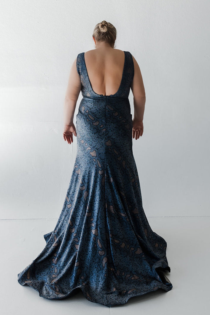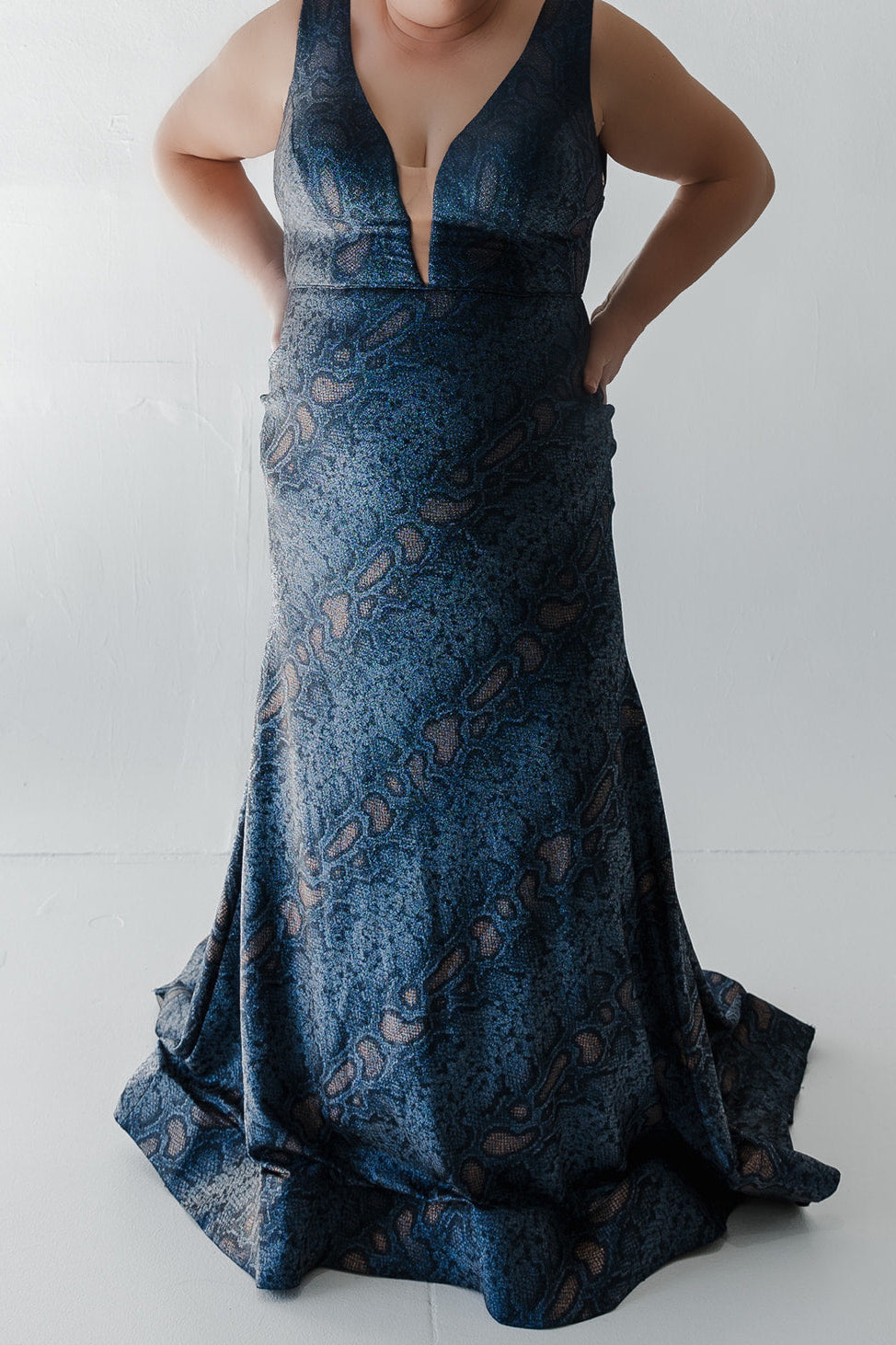 The Venom Bleu Maxi Gown is an exquisite piece that perfectly marries elegance with a touch of mystique. Featuring a deep V-neckline that adds a daring element, the gown is crafted from a luxurious midnight blue fabric overlaid with intricate lace detailing, creating a captivating texture and depth. The floor-length skirt flares slightly, adding a graceful flow to the silhouette, ideal for formal events and celebrations.