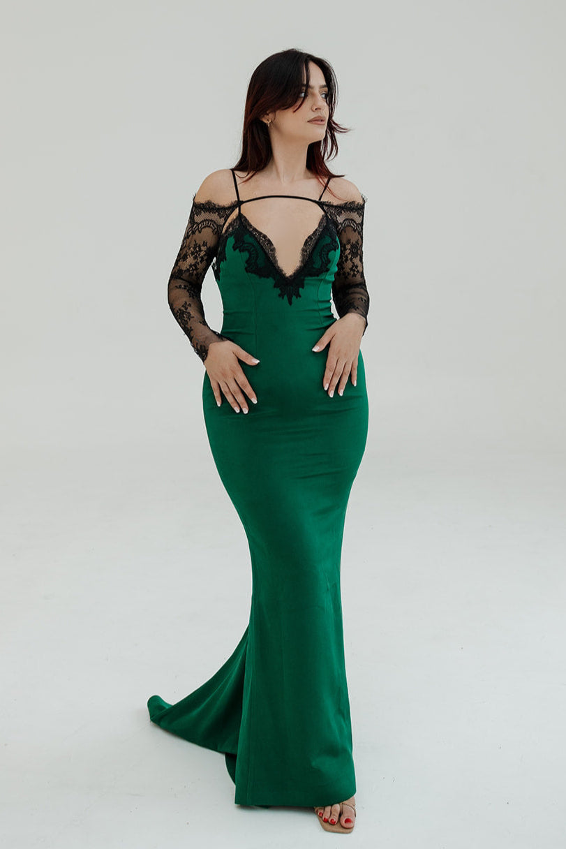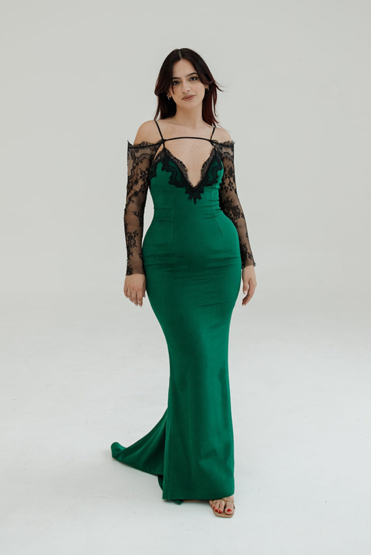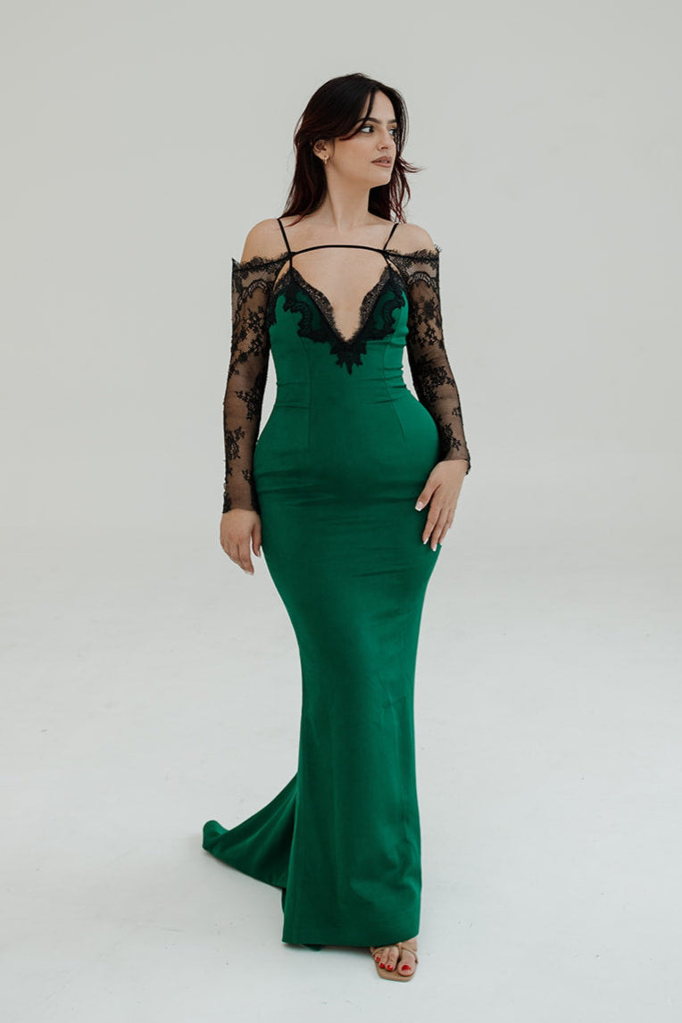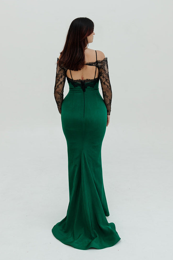 The Katrina Emerald Lace Gown combines elegance and allure with its rich green hue and delicate lace accents. This gown is sophisticated and romantic and has an off-shoulder neckline and a body-skimming silhouette. The intricate lace detailing along the neckline adds a touch of timeless charm.