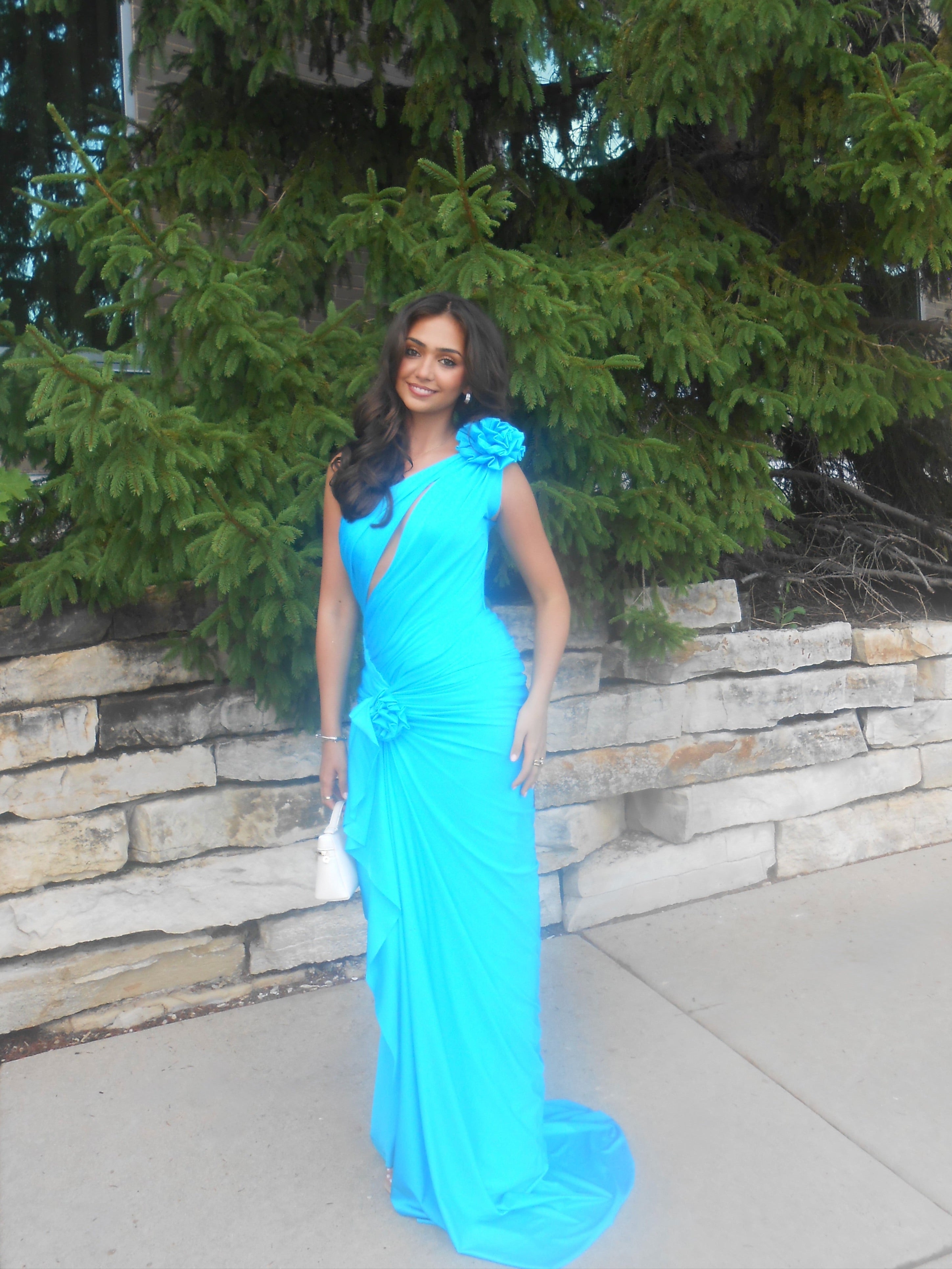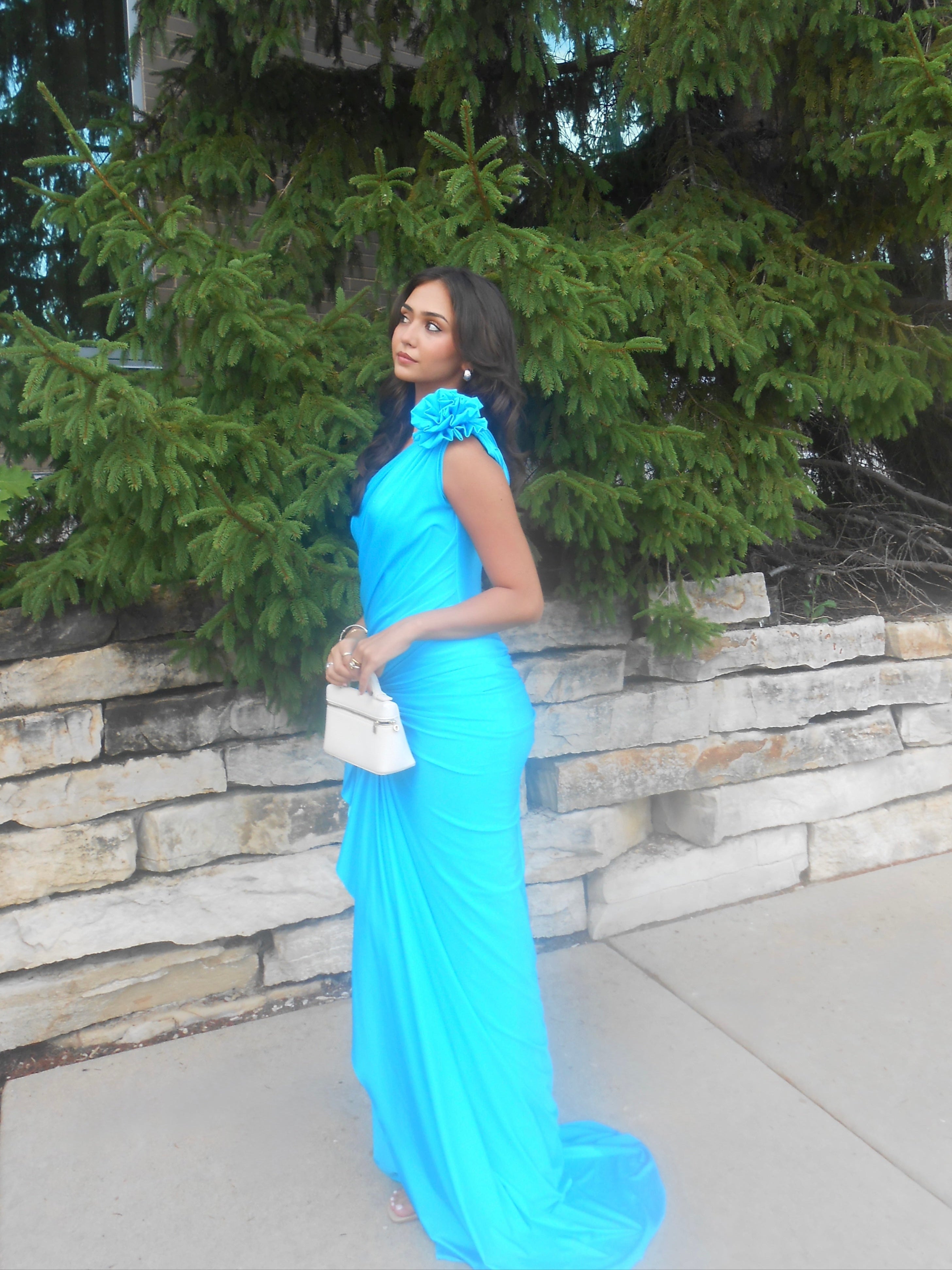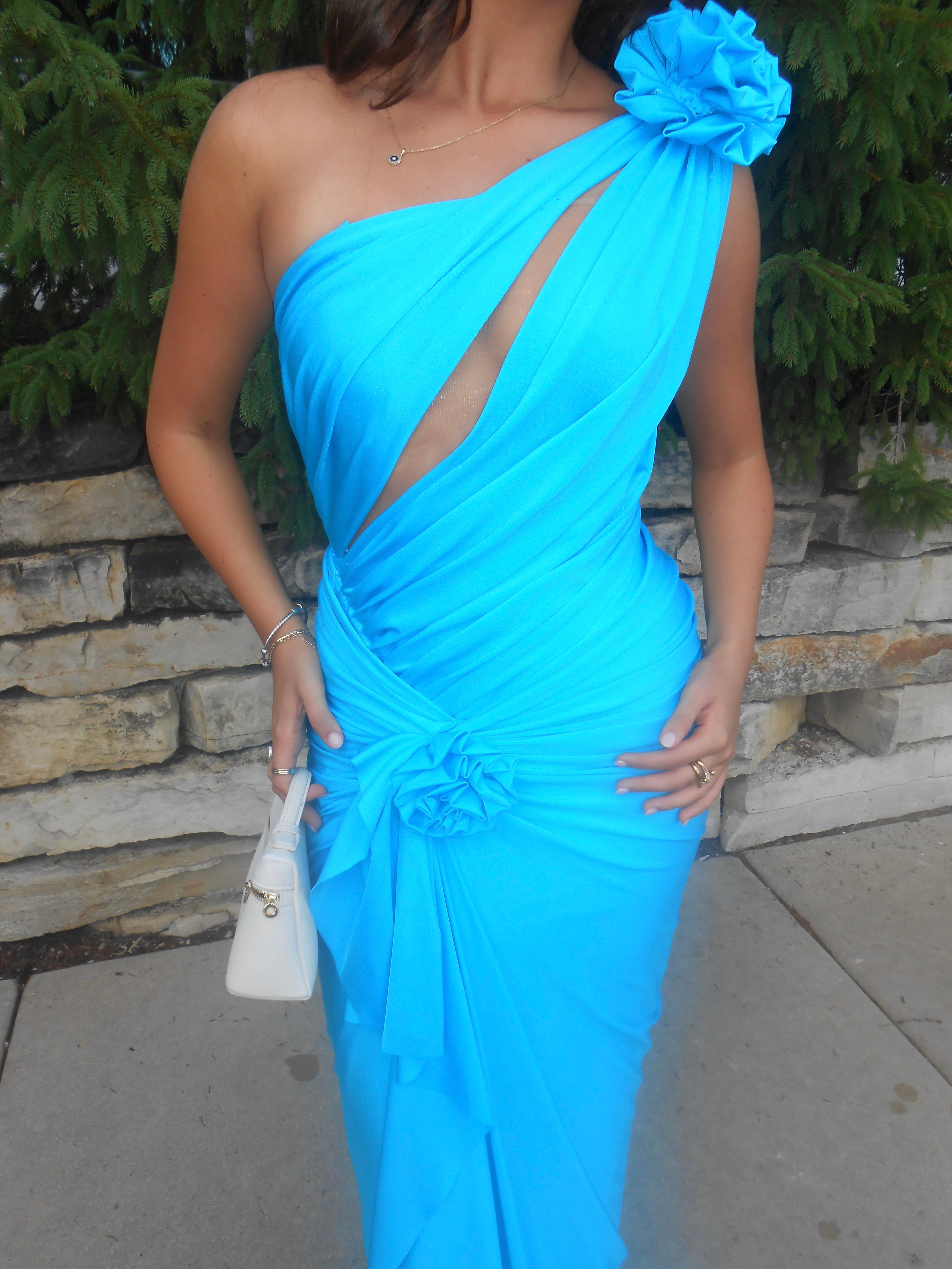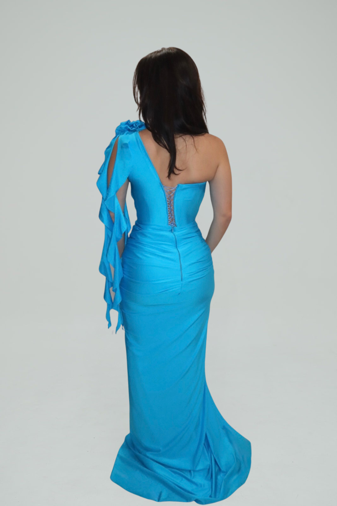 A vision of sculptural romance, the Ocean Bloom Draped Gown is crafted in an electric turquoise hue that demands the spotlight. Designed with an asymmetrical one-shoulder silhouette, this piece features soft ruching, cascading fabric layers, and dramatic rosette details at the shoulder and hip. The side cutout and fitted bodice enhance the figure while the sweeping hemline adds movement with every step.
