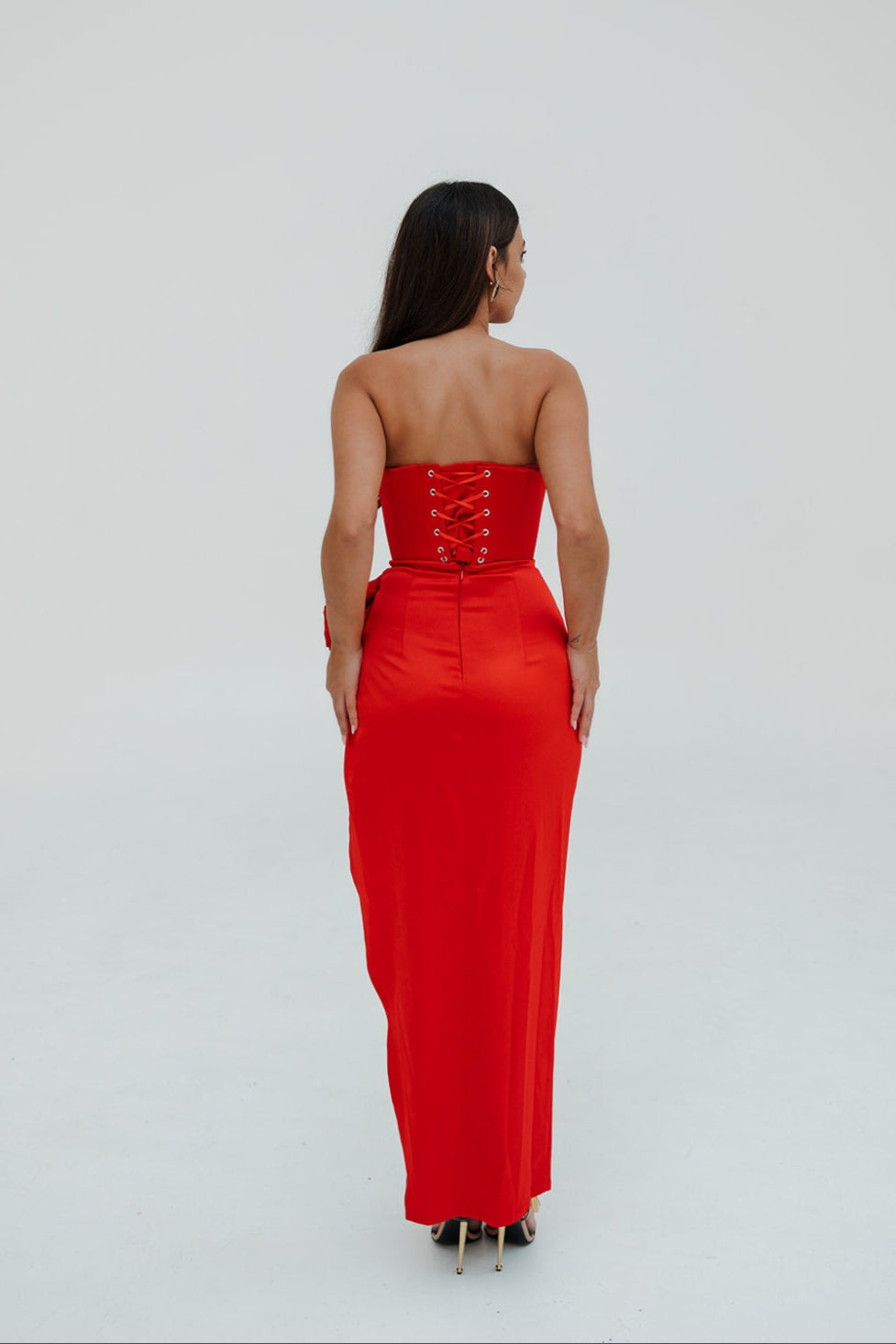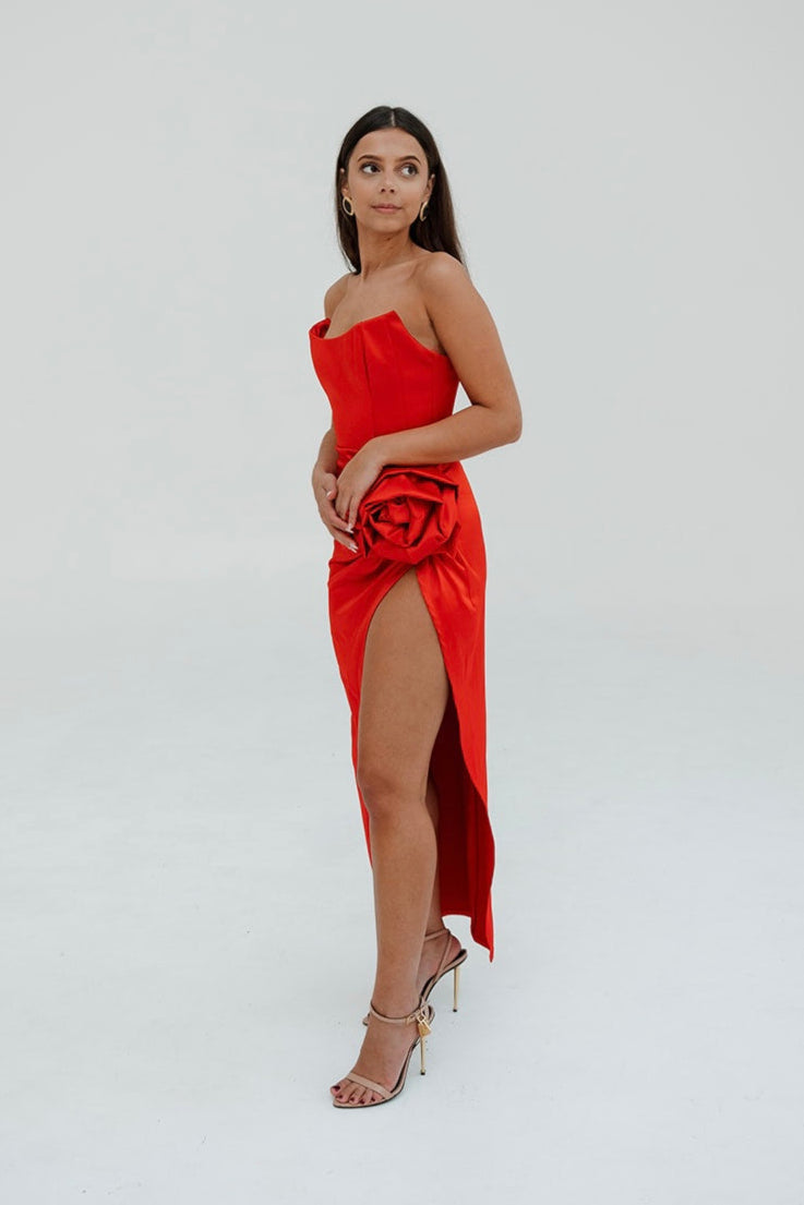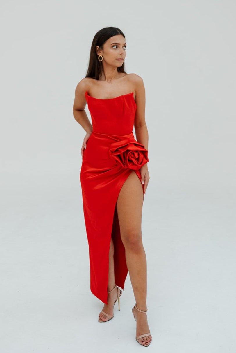 Turn heads in the Trendafil Red Gown, a bold red dress that oozes glamour and confidence. A structured bodice and an elegant flower detail at the waist enhance the strapless neckline and dramatic thigh-high slit. Perfect for red carpet events or luxurious celebrations.
