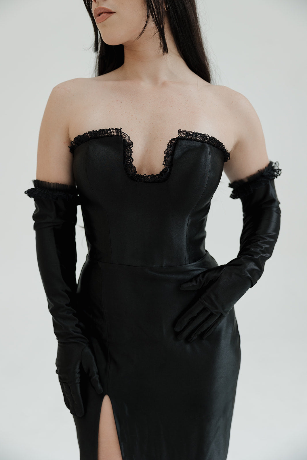 The Nora Glove Black Gown exudes old Hollywood glamour with its luxurious satin fabric, strapless design, and dramatic thigh-high slit. Delicate gloves add a vintage touch, elevating this look to unparalleled sophistication.