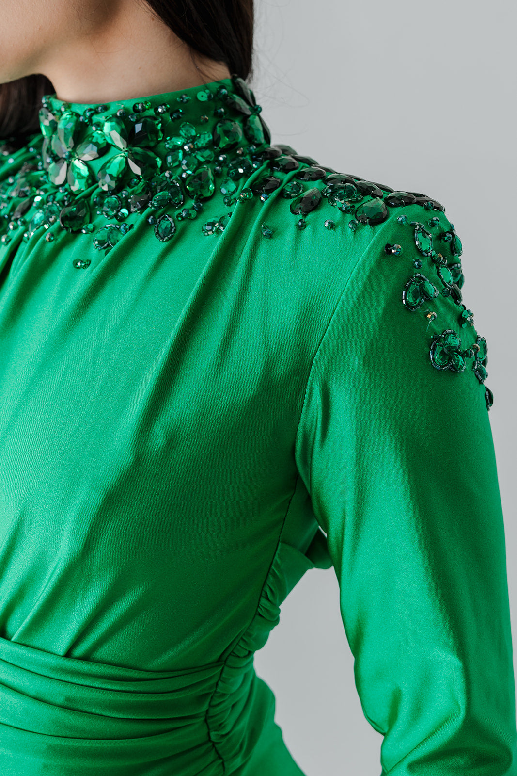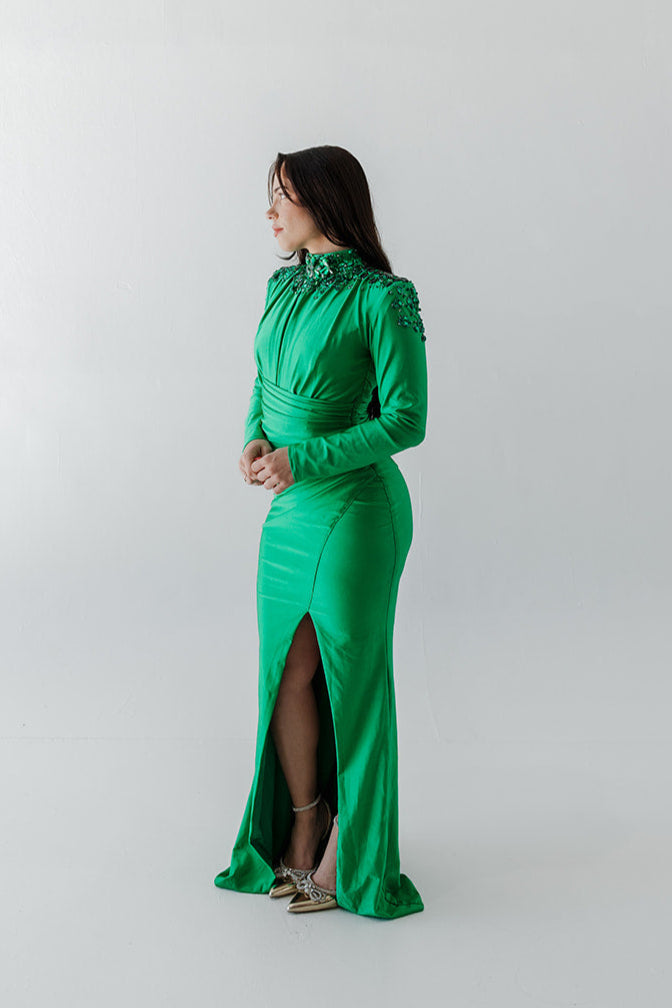 The Emra Emerald Crystal Slit Dress is a bold statement piece designed with structured shoulders, a high neckline, and a thigh-high slit. The fitted silhouette and rich green hue make this dress a showstopper for those looking to exude power and sophistication.
