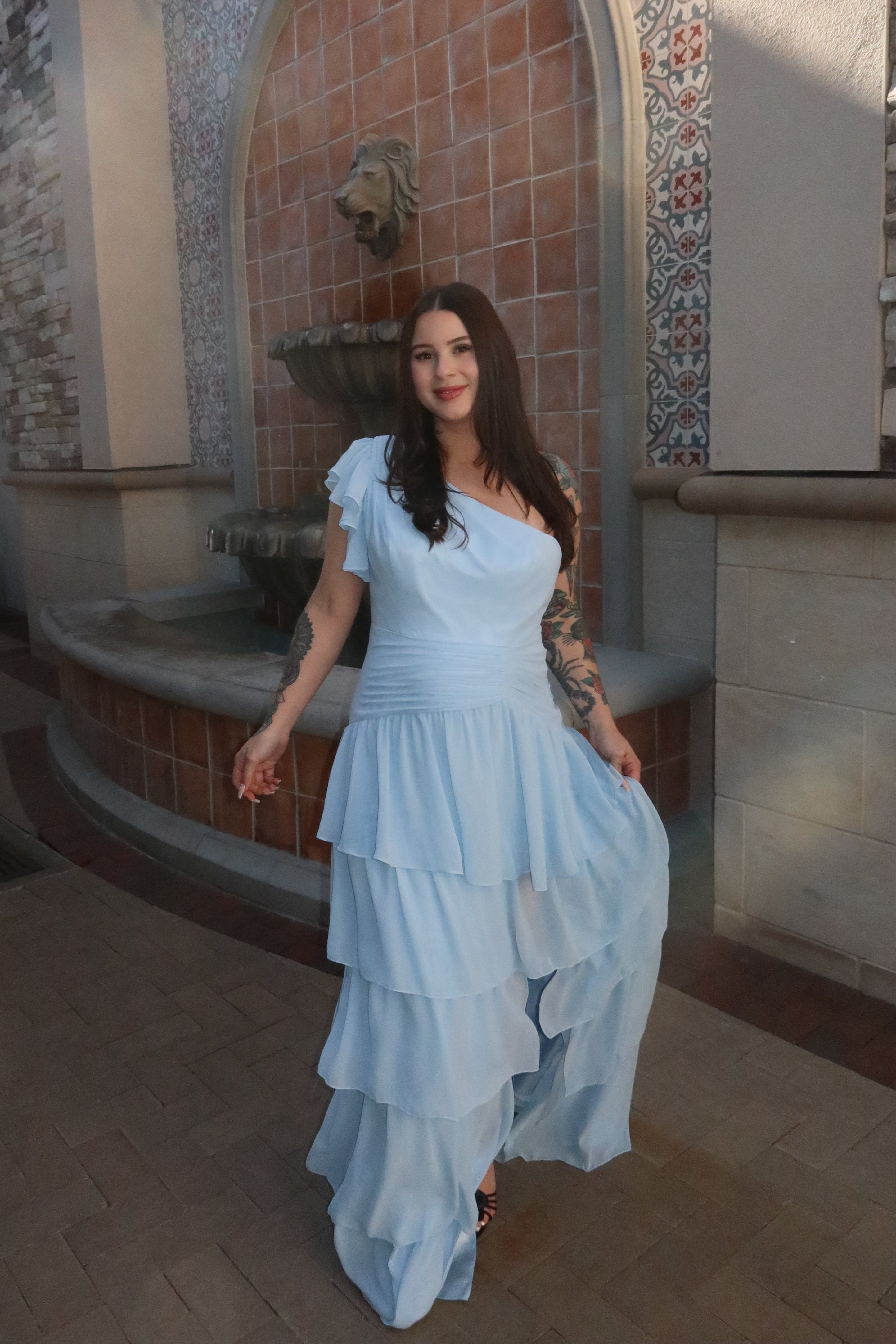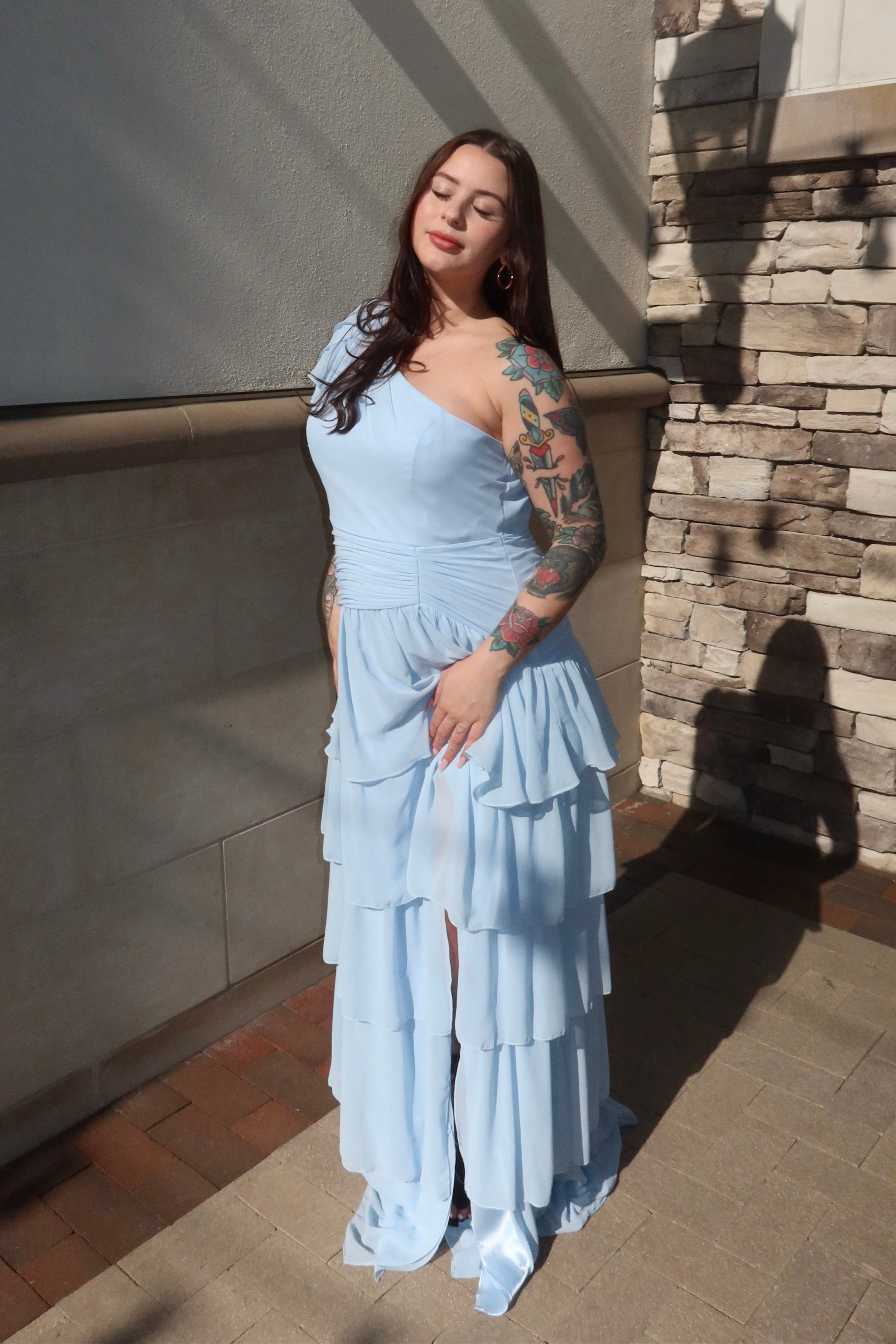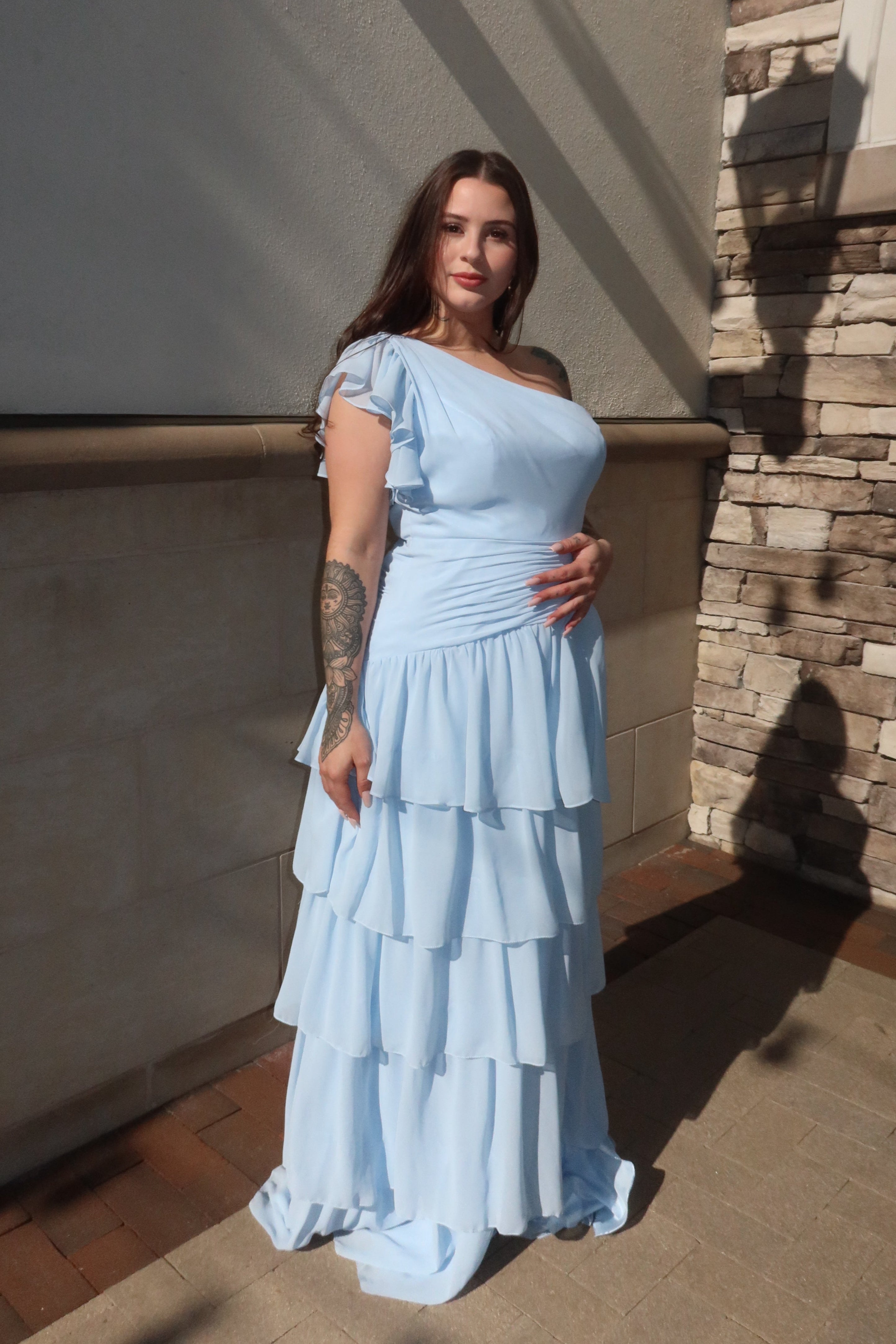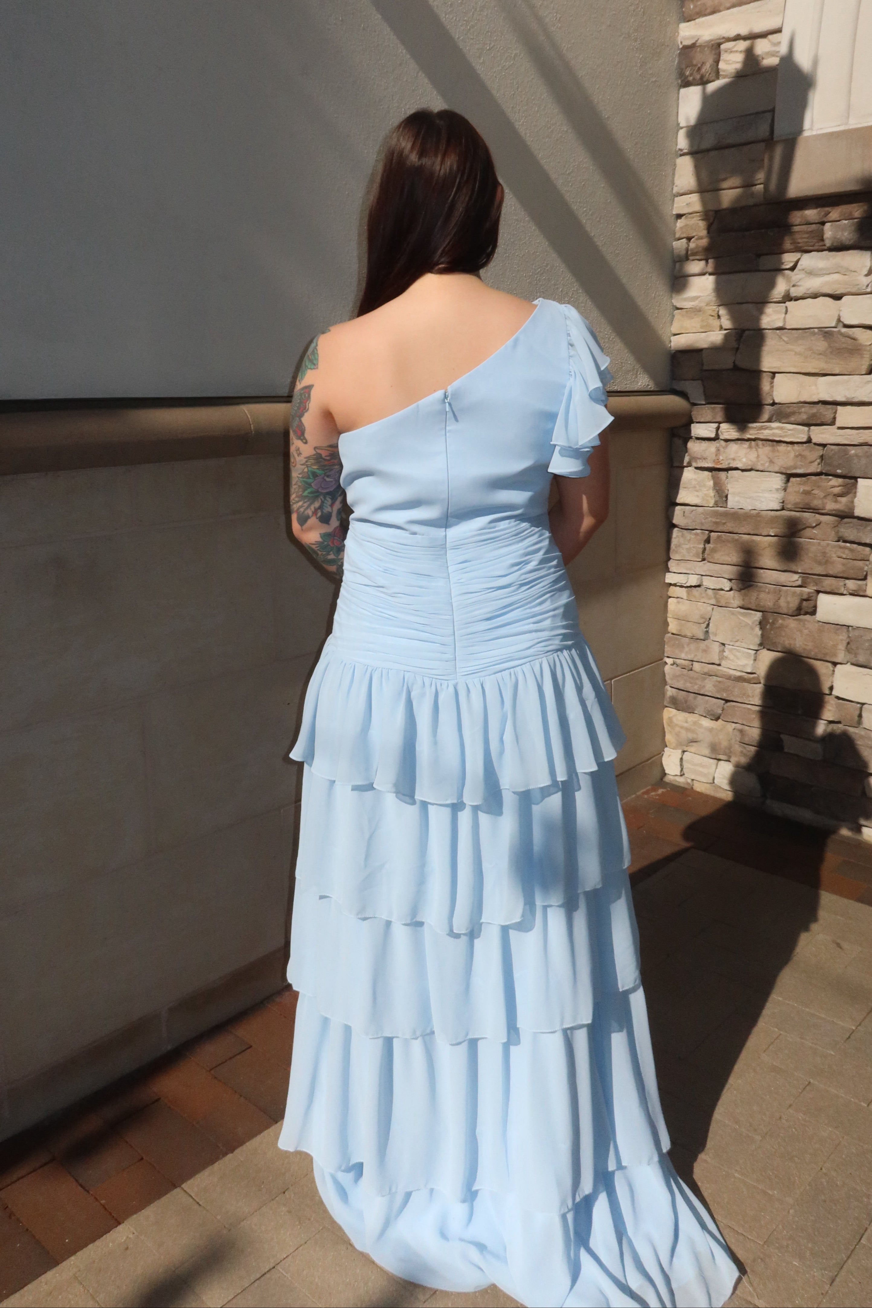 Sarande Ruffled Tier One-Shoulder Gown is a romantic statement designed for moments that call for softness with presence. Crafted in an airy, chiffon-like fabrication, this gown flows effortlessly with every step, creating a light, ethereal silhouette. The one-shoulder neckline is accented with a delicate ruffle detail, while the softly cinched waist and tiered skirt add movement and dimension. A subtle front slit offers just the right touch of allure, balancing elegance with ease.