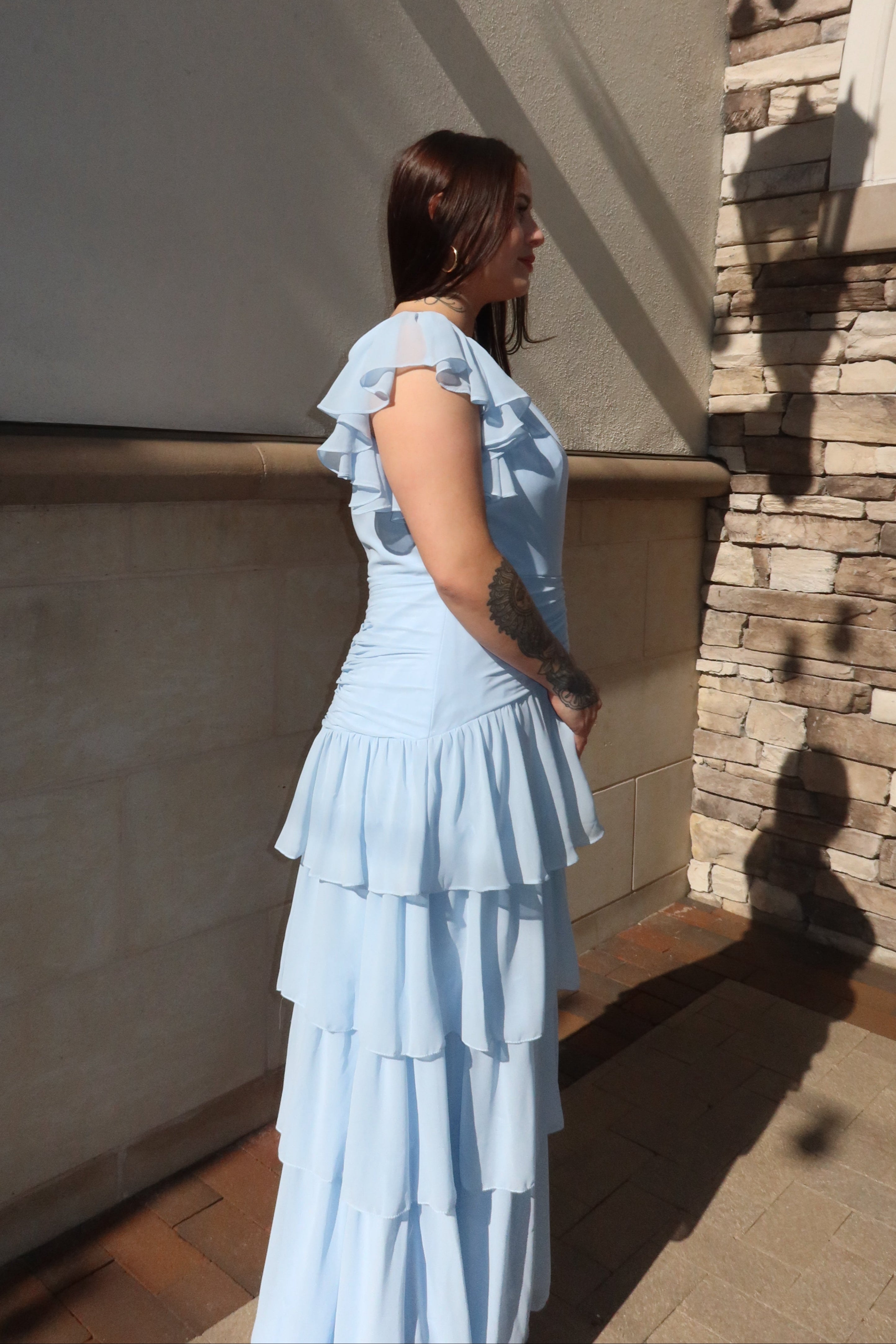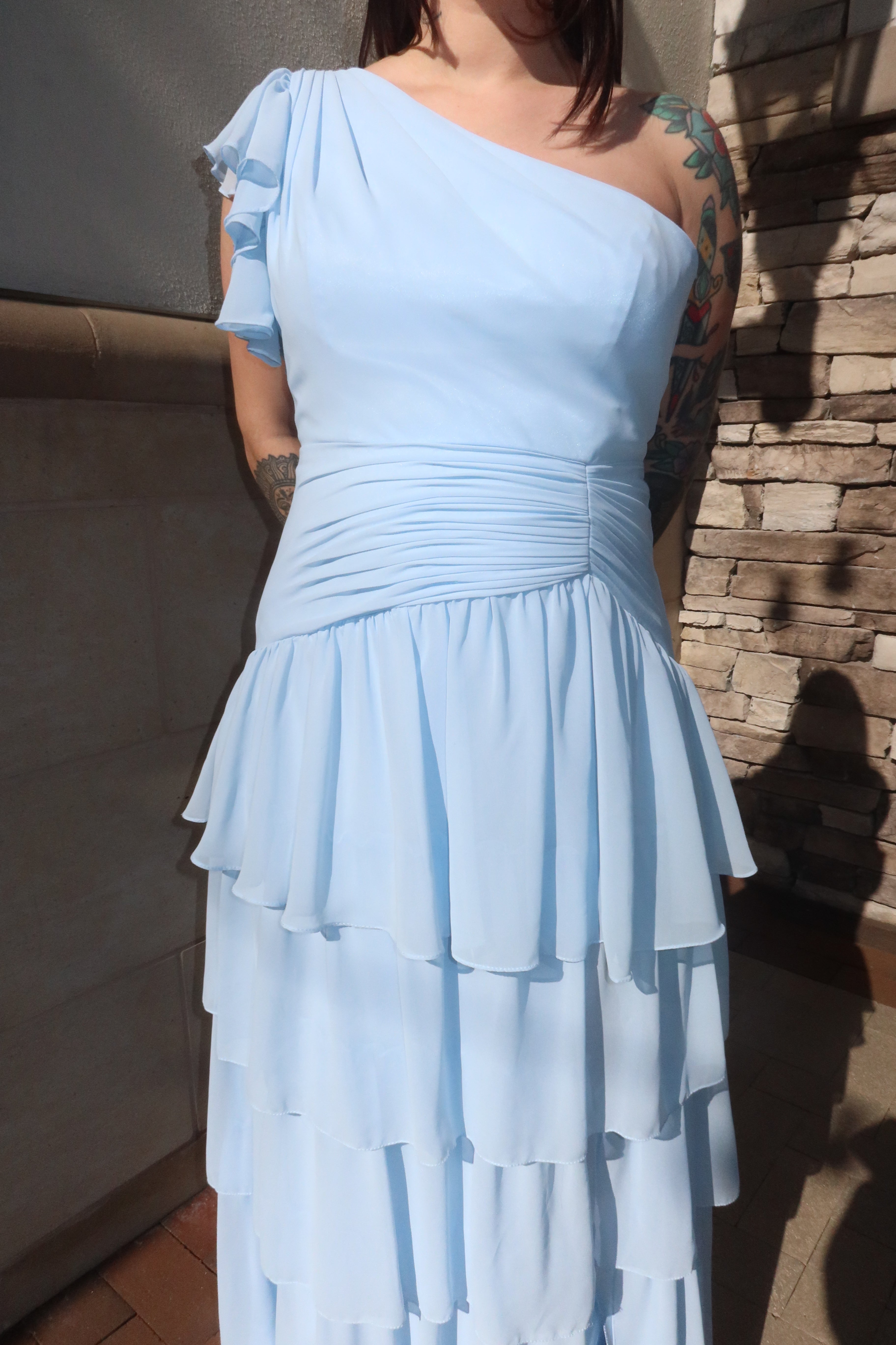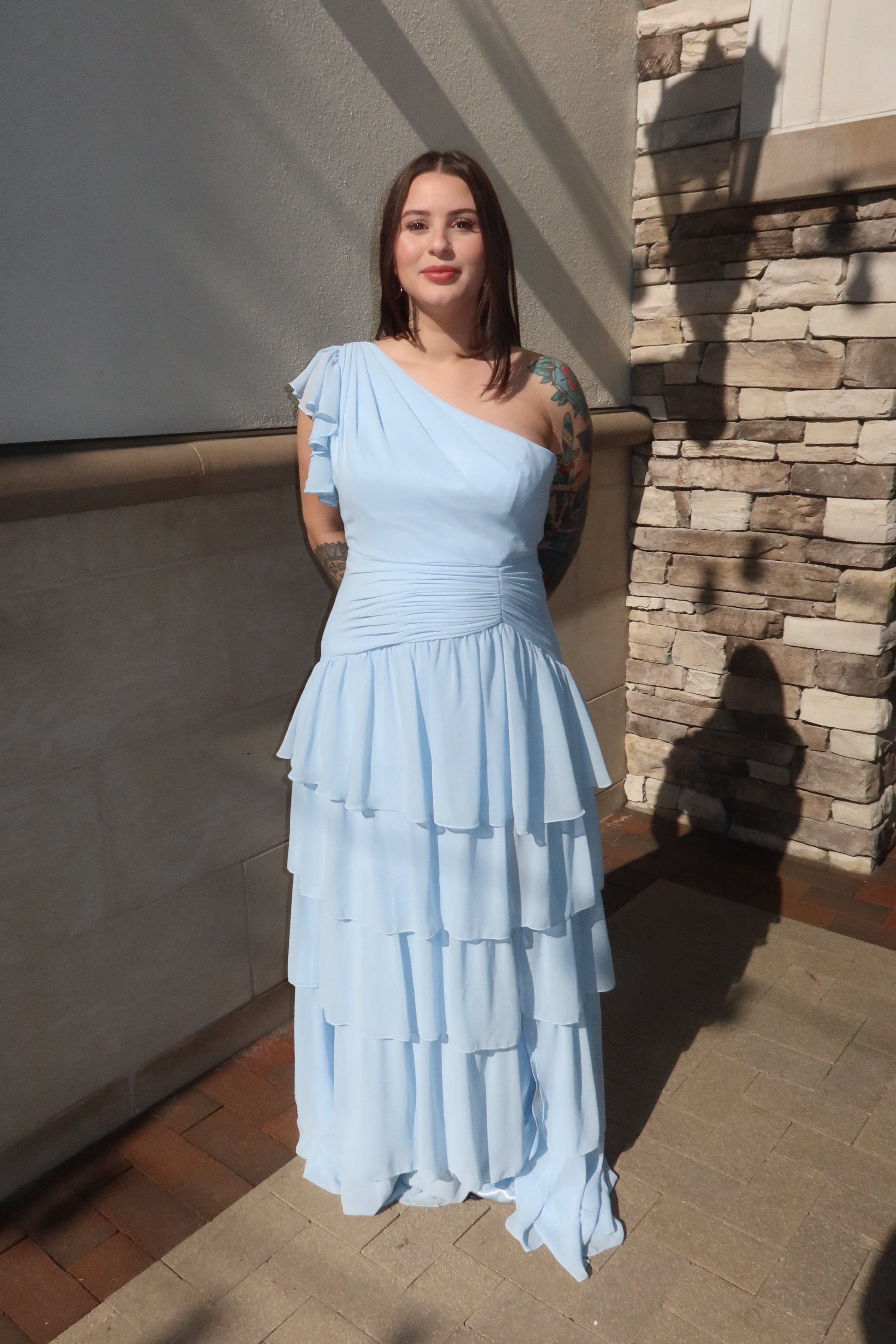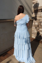 Sarande Ruffled Tier One-Shoulder Gown is a romantic statement designed for moments that call for softness with presence. Crafted in an airy, chiffon-like fabrication, this gown flows effortlessly with every step, creating a light, ethereal silhouette. The one-shoulder neckline is accented with a delicate ruffle detail, while the softly cinched waist and tiered skirt add movement and dimension. A subtle front slit offers just the right touch of allure, balancing elegance with ease.