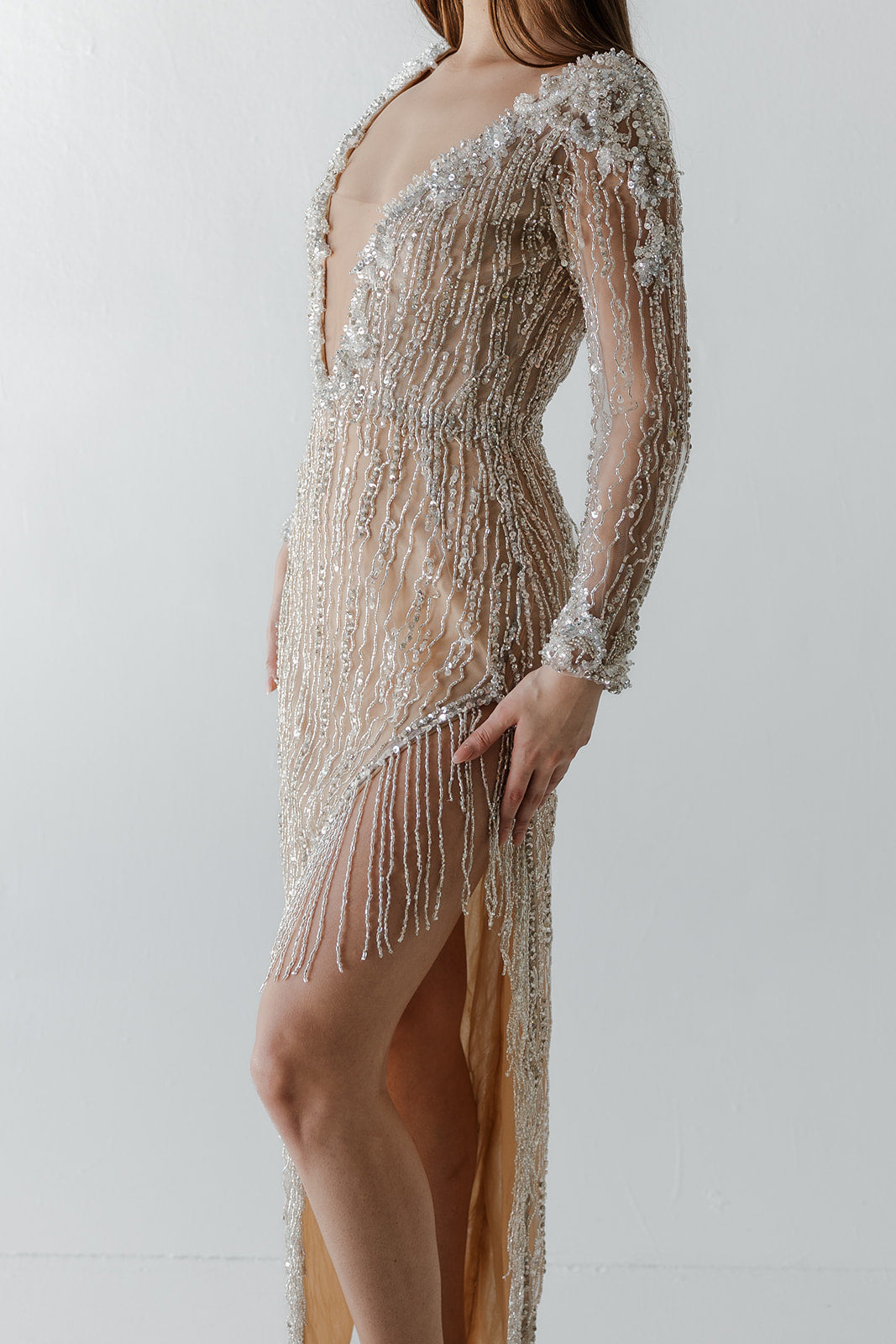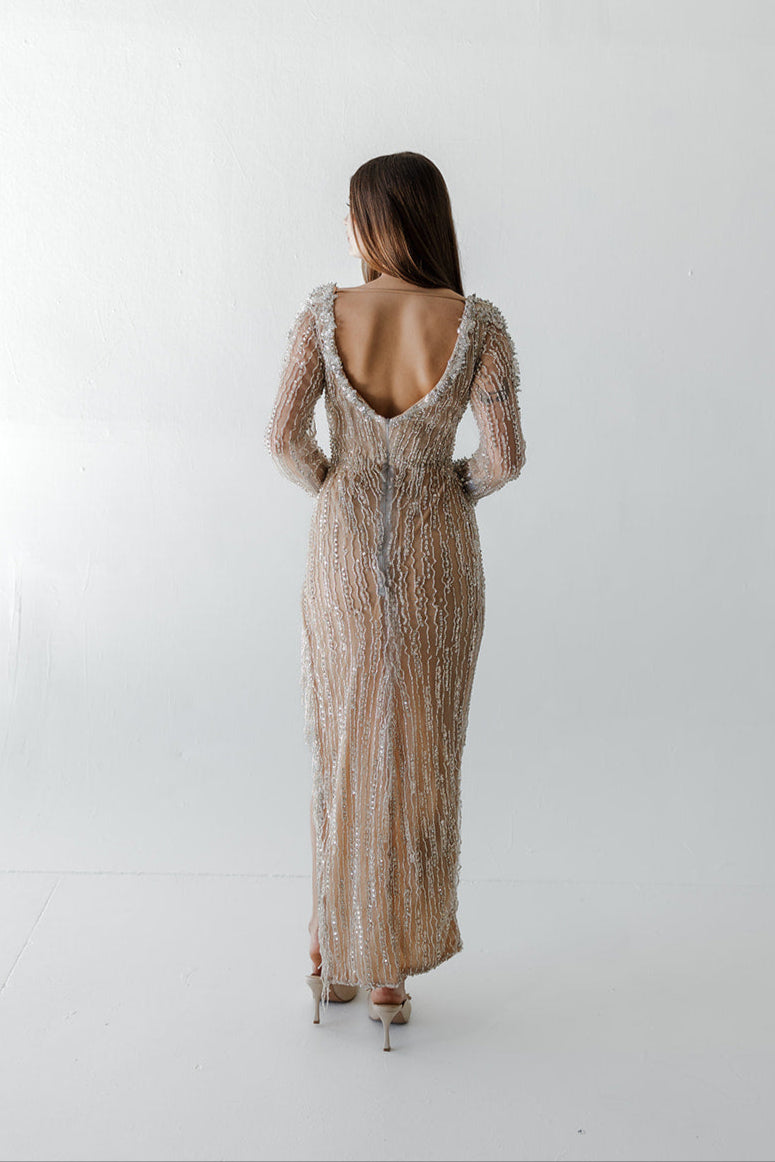 The Madison Crystal Gown is a showstopper with intricate gold embellishments and sheer long sleeves. The deep V-neckline and thigh-high slit add allure, while the shimmering fabric creates a luminous glow. This gown is perfect for making unforgettable entrances at special events.