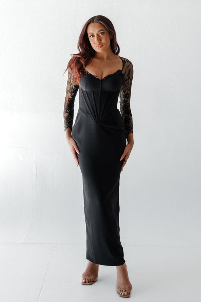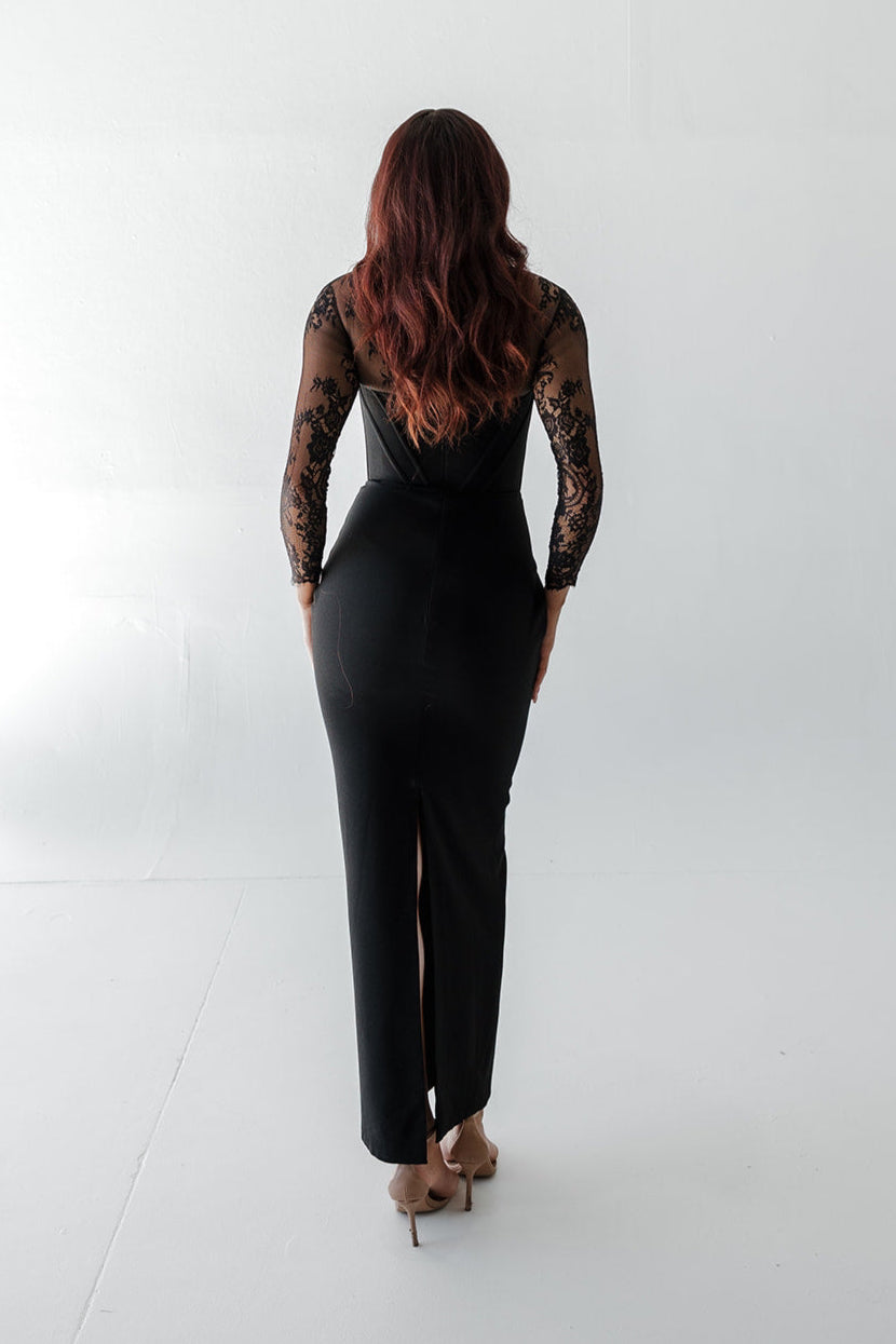 Refined and elegant, the Izra Black Lace Gown features sheer lace sleeves and a plunging neckline that exudes sophistication. The sleek black silhouette is timeless, making it an excellent choice for formal occasions. With its delicate lace detailing, this gown strikes the perfect balance between modern allure and classic elegance.