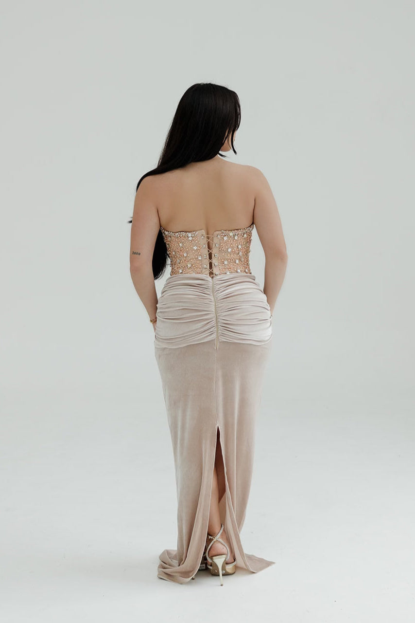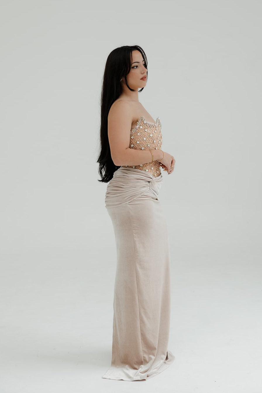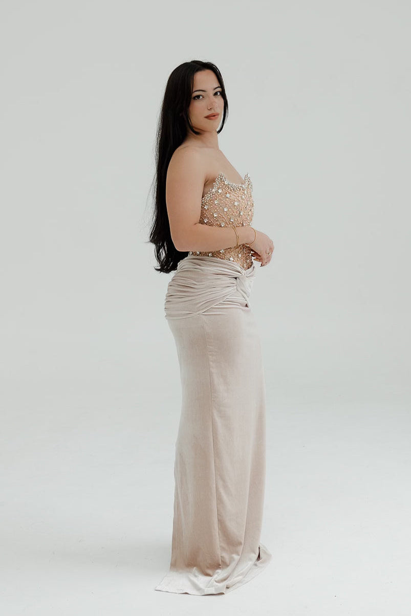 The Drita Champagne Glow Gown is a vision of understated elegance. Its shimmering fabric and sleek silhouette gracefully contour the body, while the off-shoulder neckline adds a touch of sensuality. This gown radiates sophistication and charm, perfect for evening galas or upscale weddings.