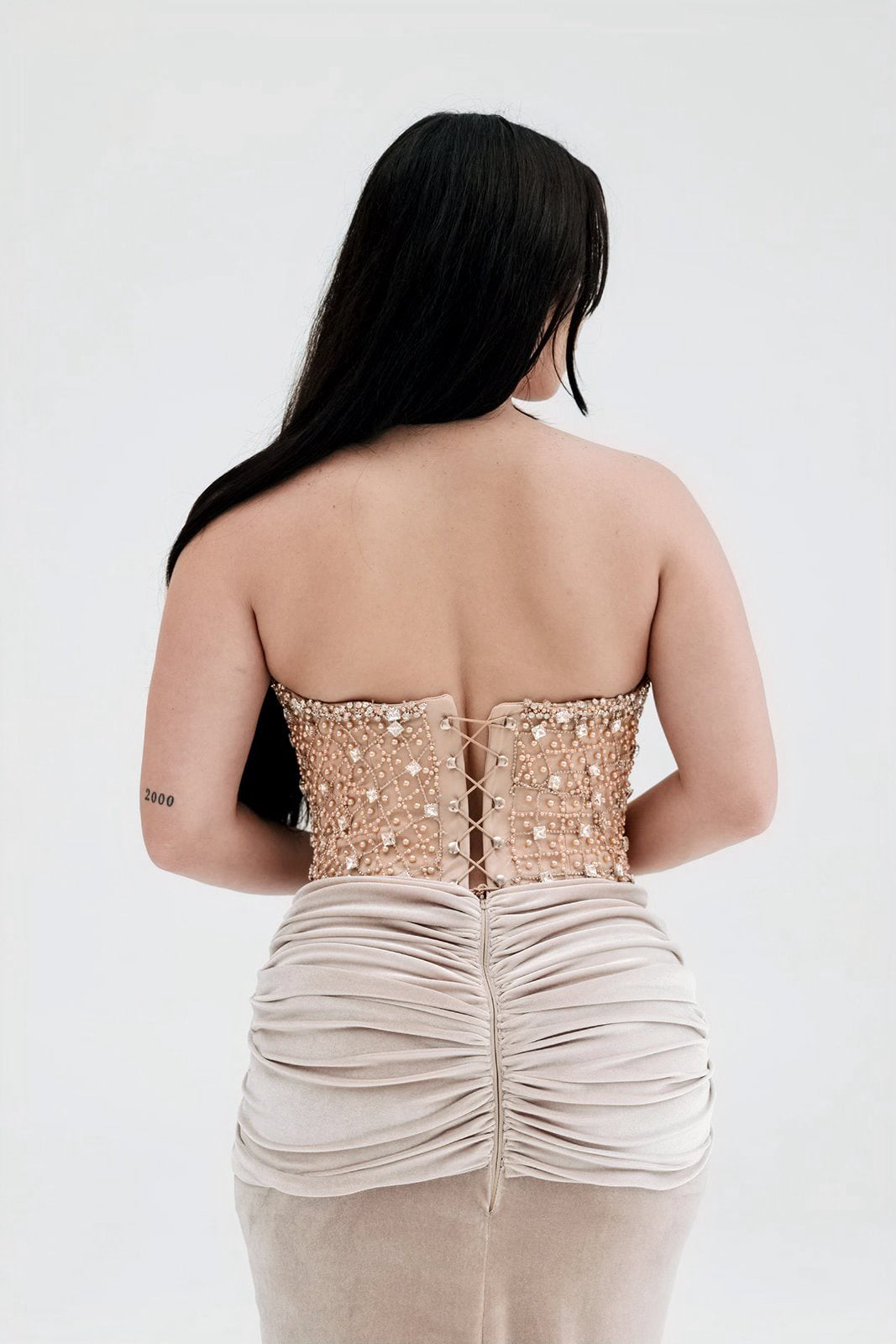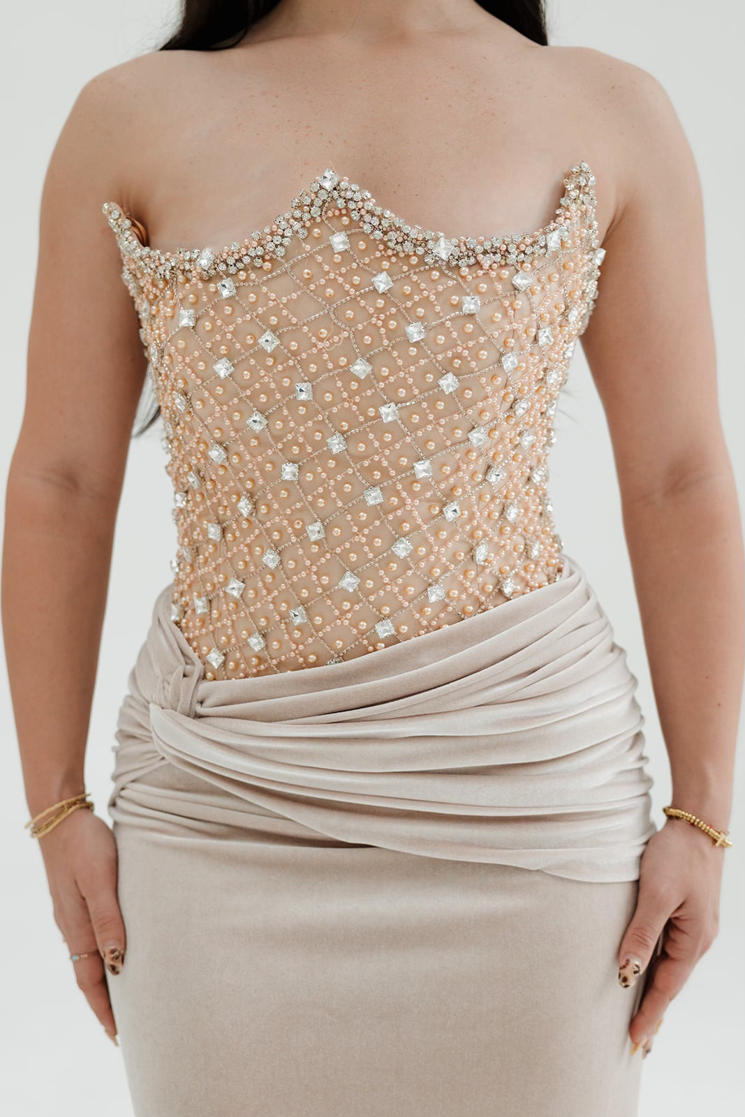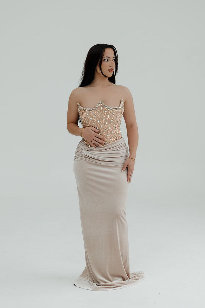 The Drita Champagne Glow Gown is a vision of understated elegance. Its shimmering fabric and sleek silhouette gracefully contour the body, while the off-shoulder neckline adds a touch of sensuality. This gown radiates sophistication and charm, perfect for evening galas or upscale weddings.