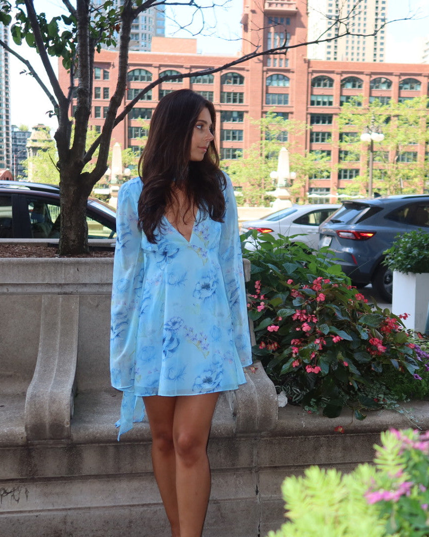 Whimsical yet daring, the Bluebell Bloom Flare Dress is made for the dreamer with an edge. This airy chiffon mini dress features a plunging V-neckline, romantic bell sleeves, and a flowing A-line skirt that twirls with every step. The soft watercolor floral print in shades of sky blue adds an ethereal touch with a matching attached scarf.