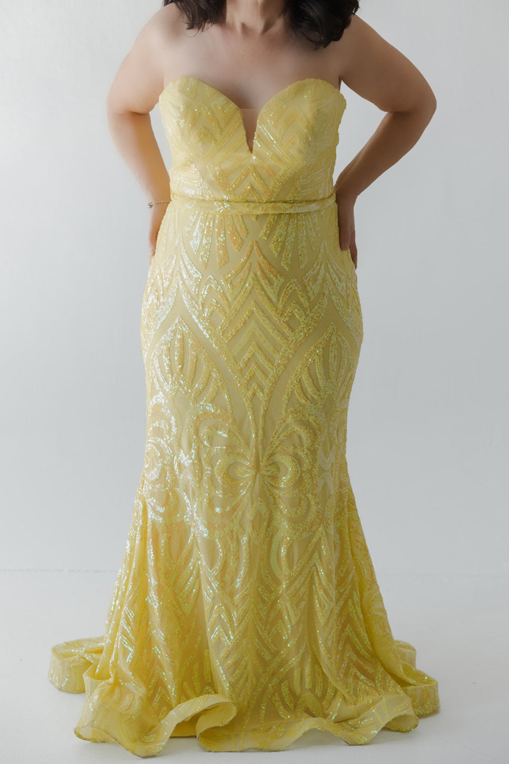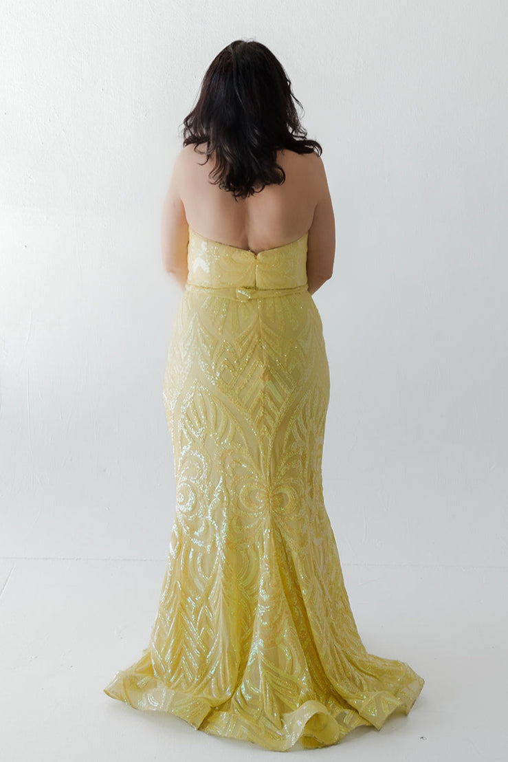 The Primavera Strapless Gown dazzles with its radiant yellow hue and intricate sequin detailing that creates a stunning visual tapestry. This strapless gown features a sweetheart neckline that enhances the elegance of the silhouette, while the form-fitting design flows into a graceful train, adding a touch of drama. It's a perfect choice for formal events where you want to shine brightly.