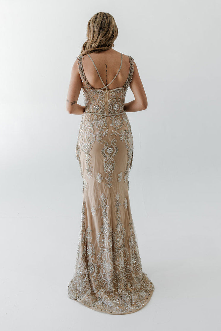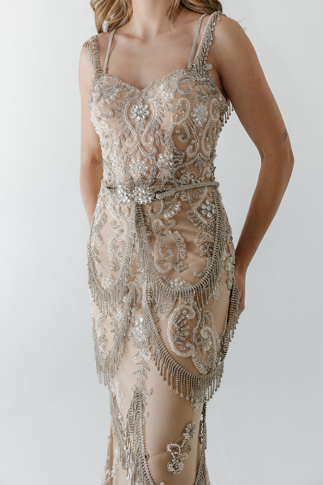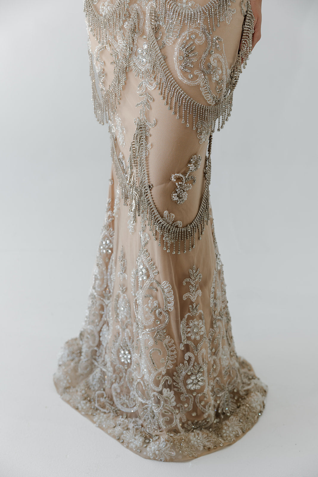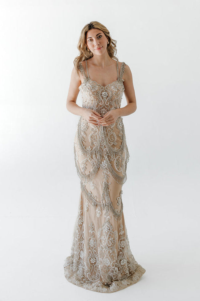 The Estrella Silver Cascade Gown is a luxurious piece adorned with intricate beading and delicate layers of tulle. Its soft gold hue and fitted bodice create an ethereal look, perfect for grand celebrations and formal events.
