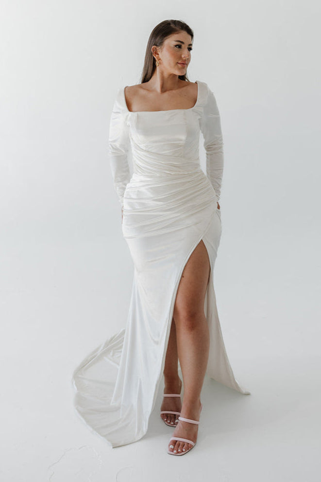 The Nita White Velvet Dress is a vision of modern elegance. Featuring a structured square neckline and a daring thigh-high slit, this fitted gown is perfect for exuding confidence and sophistication. Its pristine white hue makes it ideal for bridal events or upscale occasions.