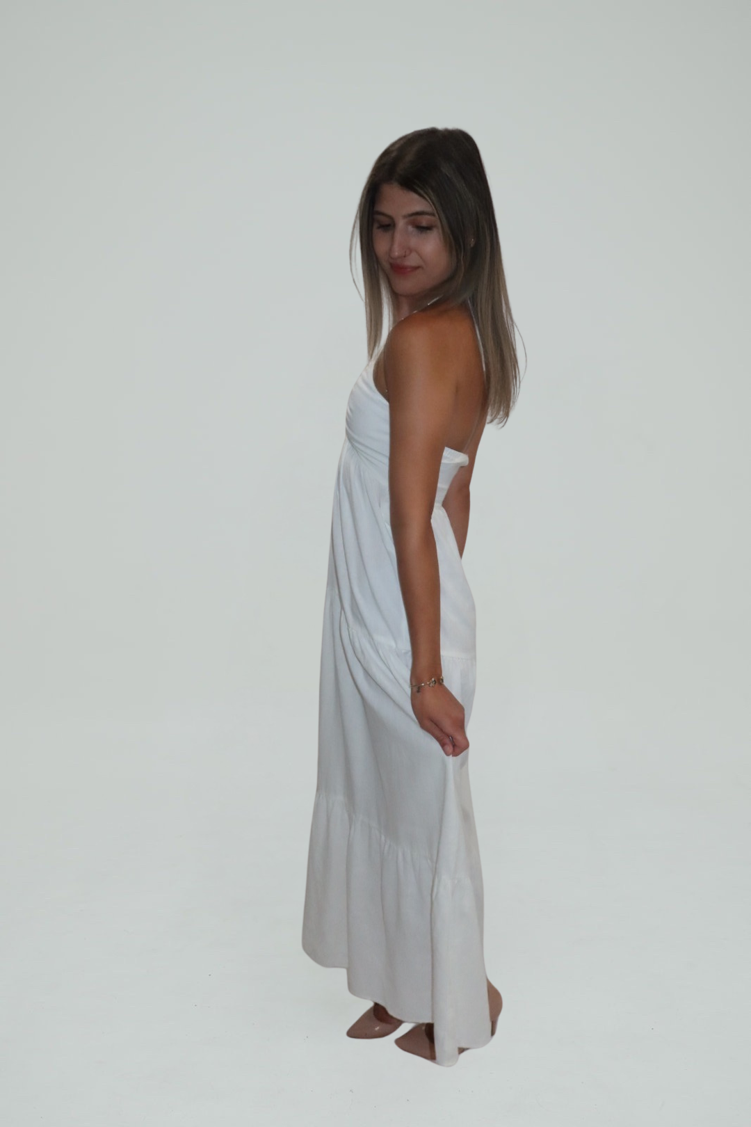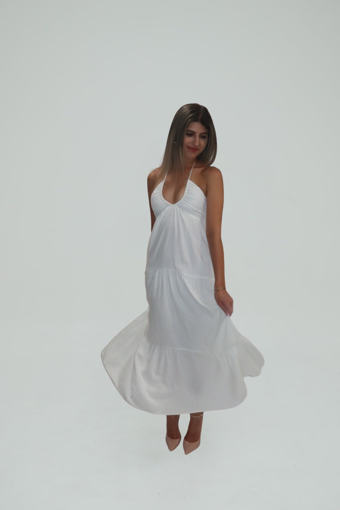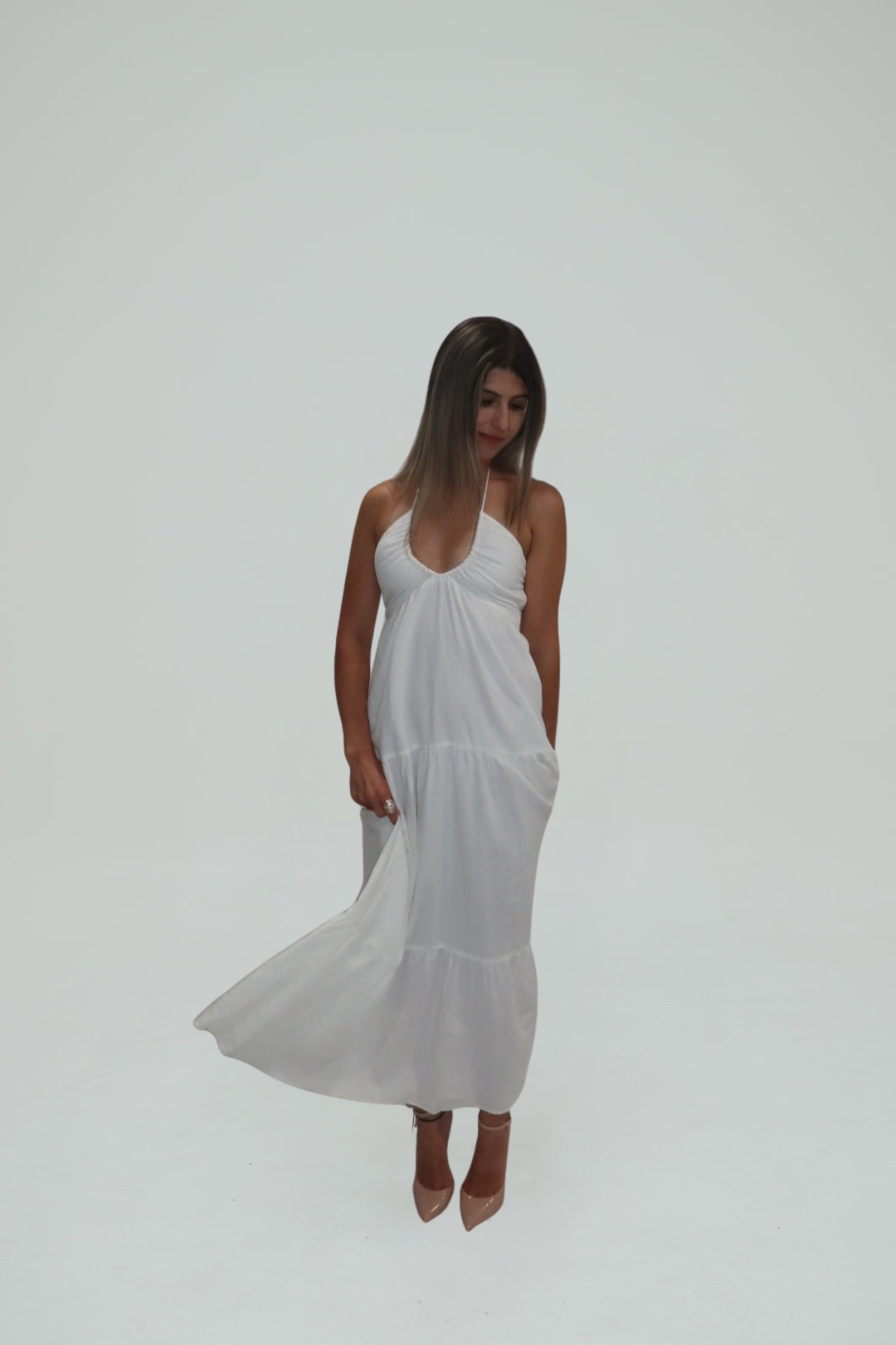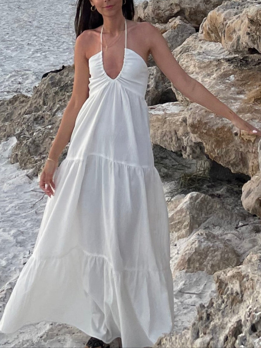 Breeze through summer days and moonlit evenings in the Amalfi Whisper Halter Maxi. Crafted from a lightweight white fabric, this flowy halter dress features a softly ruched bodice and a plunging neckline that elongates the silhouette. The tiered skirt adds graceful movement, making it a dreamy choice for beach vacations, bridal events, or sunset dinners.